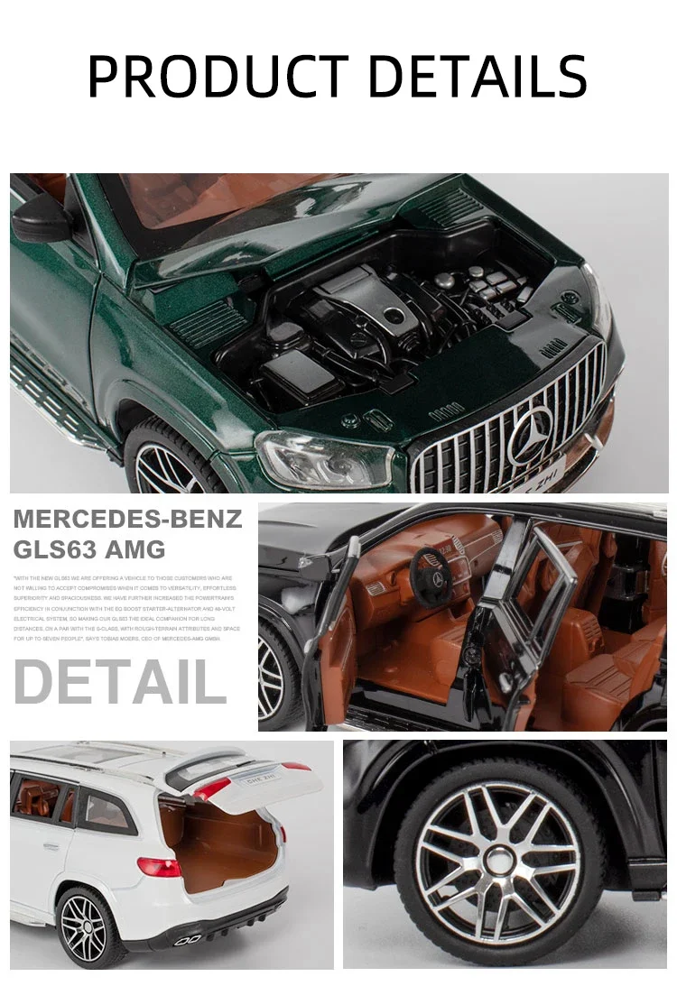 - This 1:24 scale diecast model captures the sleek silhouette and muscular stance of the real Mercedes Benz GLS63 AMG SUV in stunning realism, with meticulous attention to design details and proportions.