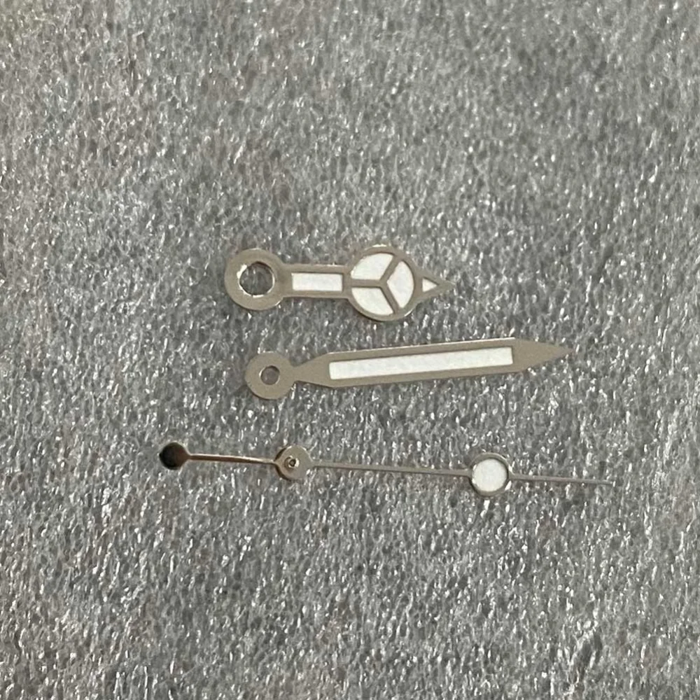 Experience the perfect blend of style and functionality with this set of Mercedes-Benz silver watch hands, designed for replacement on men's watches. Crafted from polished metallic material, these hands feature a sleek, reflective silver finish that catches the light beautifully. The hour hand showcases a distinctive Mercedes-Benz-inspired three-pointed star design near its base, adding an extra touch of sophistication. The inner sections of both the hour and minute hands are coated with vibrant green luminous material, allowing for easy reading in low-light conditions. The slender second hand maintains a minimalist yet precise appearance. With dimensions of approximately 7.75 mm in width, 12 mm in height, and 12.5 mm in length, these hands are compatible with Miyota 2115 quartz movements. Enhance your timepiece’s style today!