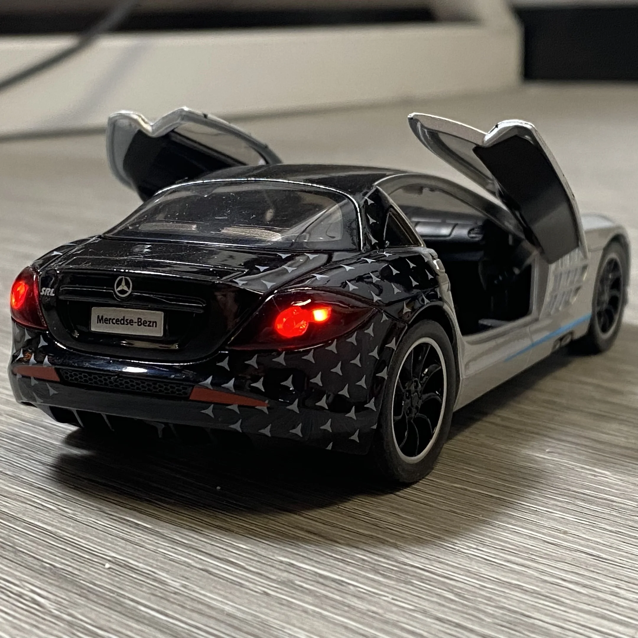 Bring the thrill of luxury and high-performance to your collection with this detailed 1:32 scale die-cast model of the Mercedes-Benz SLR McLaren. Crafted from durable alloy, its sleek metallic silver finish captures the essence of the original supercar’s elegance. The aerodynamic body features finely sculpted curves, along with vent details on the hood and sides, emphasizing speed and sophistication. The seamlessly integrated, tinted windshield enhances realism, while the gull-wing style doors showcase textured surfaces with triangular indentations for authentic surface detailing. The alloy wheels, with detailed black tires, complete the sporty look. Functional LED headlights and realistic sound effects powered by batteries make this model an engaging and visually striking display piece that exudes craftsmanship and style.