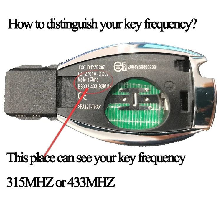 This smart car key is designed to elevate your Mercedes-Benz ownership experience. Its sleek, elongated shape and shiny metallic finish exude sophistication, making it a premium accessory for your vehicle. With three intuitive buttons, including a prominent black panic button labeled in red, you have easy control at your fingertips. Crafted from durable black plastic with metallic trim, this key not only looks great but also feels robust in your hand. Compatible with a wide range of models from 2001 to 2010, it operates on both 433 MHz and 315 MHz frequencies, ensuring seamless functionality. Get ready to enjoy the convenience and style this smart car key brings to your daily drives.