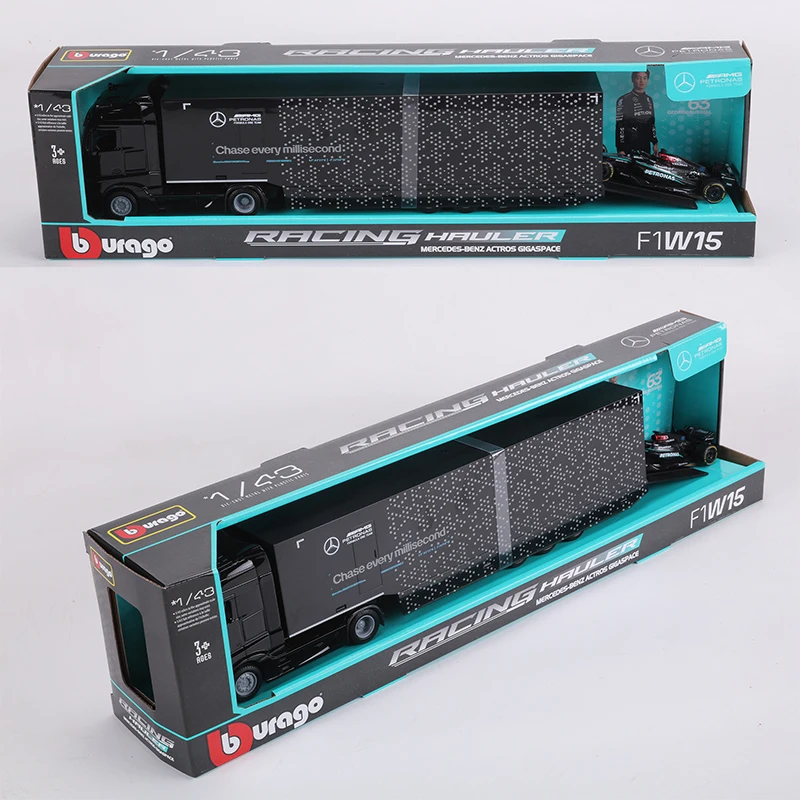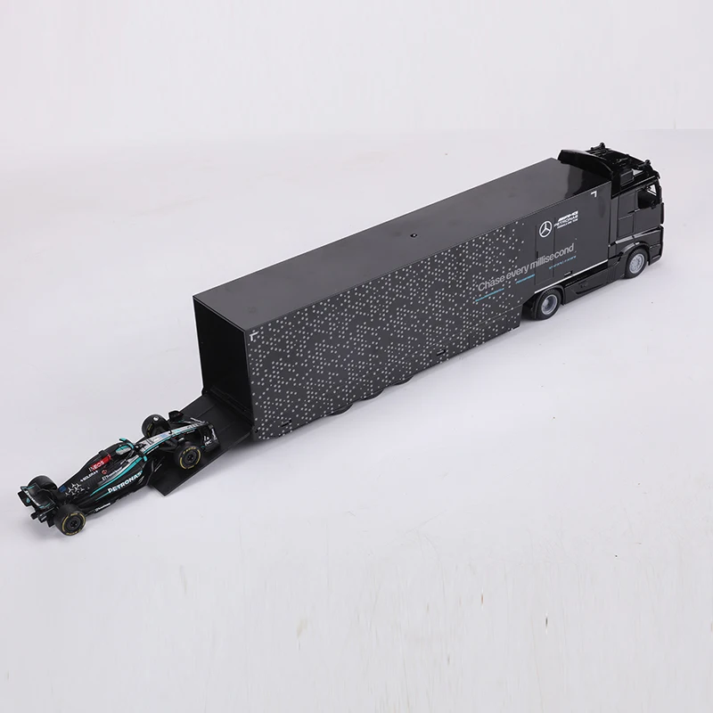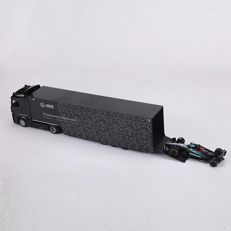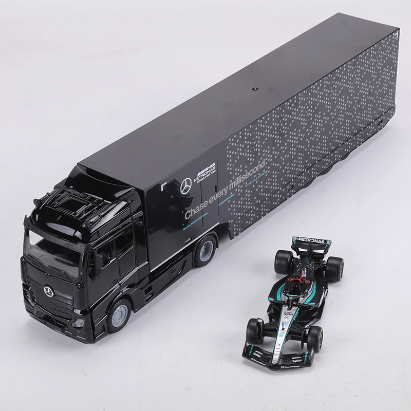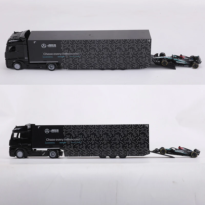 Experience the realism of the Mercedes-Benz container transport truck and AMG F1 Team W15 Formula 2024 #63 with this detailed 1:43 scale diecast model set. Crafted from high-quality metal and finished in a sleek black, it features authentic design elements such as a modern cab, prominent grille, reflective glossy surface, and meticulously detailed trailer with branding and subtle dotted patterns. The accompanying F1 car showcases aerodynamic craftsmanship, sponsor logos, and vibrant racing livery, capturing the high-performance spirit of modern motorsport. Perfect for adult collectors, this non-electronic model offers a sophisticated display piece that emphasizes realism, craftsmanship, and dynamic style.