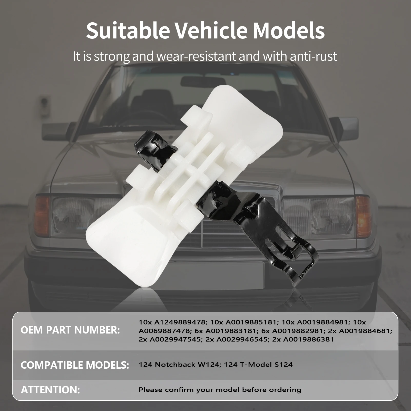 This set of 60 high-quality metal clips is specifically designed for repairing and securing side moldings and panels on Mercedes-Benz W124 models, including the 124 Notchback and T-Model S124. Compatible with OE/OEM reference numbers A1249889478, A0019885181, A0019884981, A0069887478, A0019883181, and others, these clips ensure a perfect fit and reliable hold. The package includes 10 clips each for the first four reference numbers, 6 clips for A0019883181 and A0019882981, along with additional clips (2 units each) for other references. Crafted with durable metal, they promise long-lasting performance in restoring your vehicle’s panels and moldings.