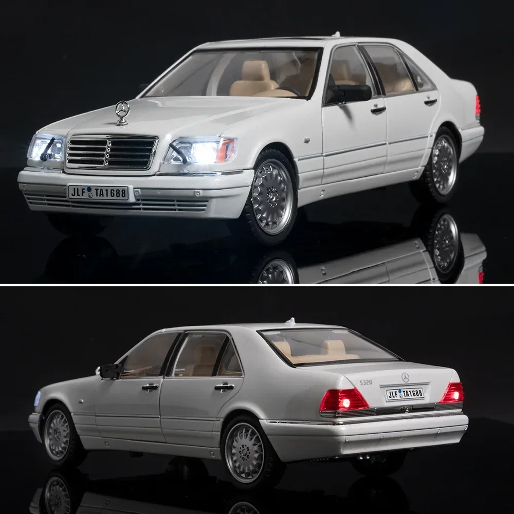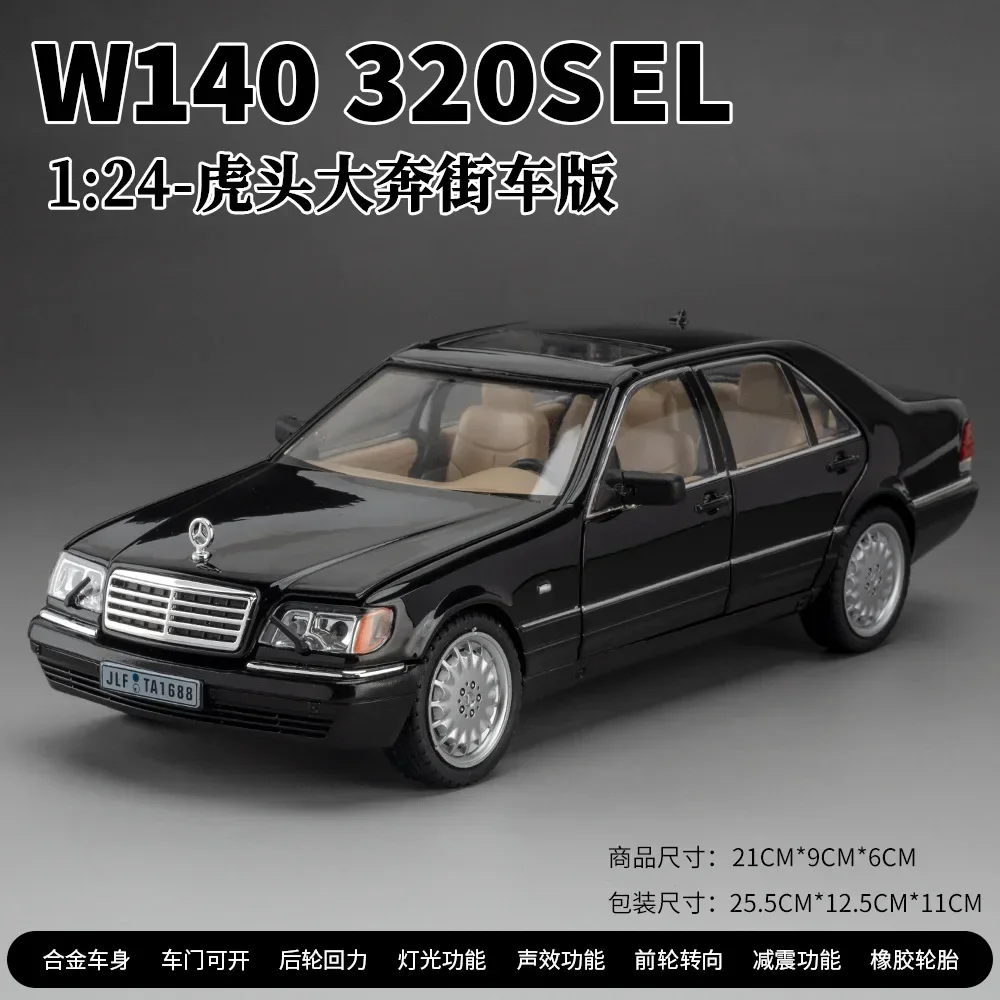 This 1:24 scale diecast model of the Mercedes-Benz W140 320SEL showcases a sleek black body with smooth lines and curves, crafted from durable metal. It features working headlights that emit light and delivers sound effects, adding to its realism. The detailed chrome grille complements the iconic Mercedes-Benz logo on the hood. Clear windows reveal an elegantly designed beige interior, while the wheels resemble alloy rims, further enhancing its authentic appearance. The model operates as a pull-back car and requires a button battery for light and sound effects (not included). This collectible piece is perfect for enthusiasts.