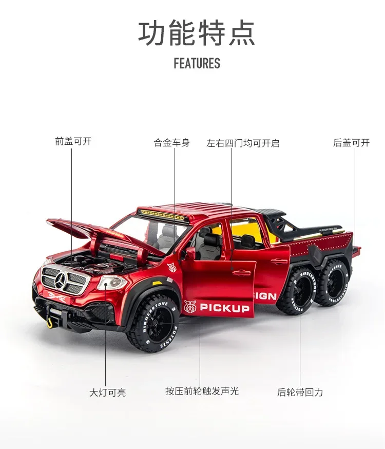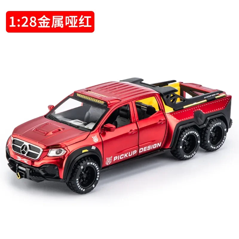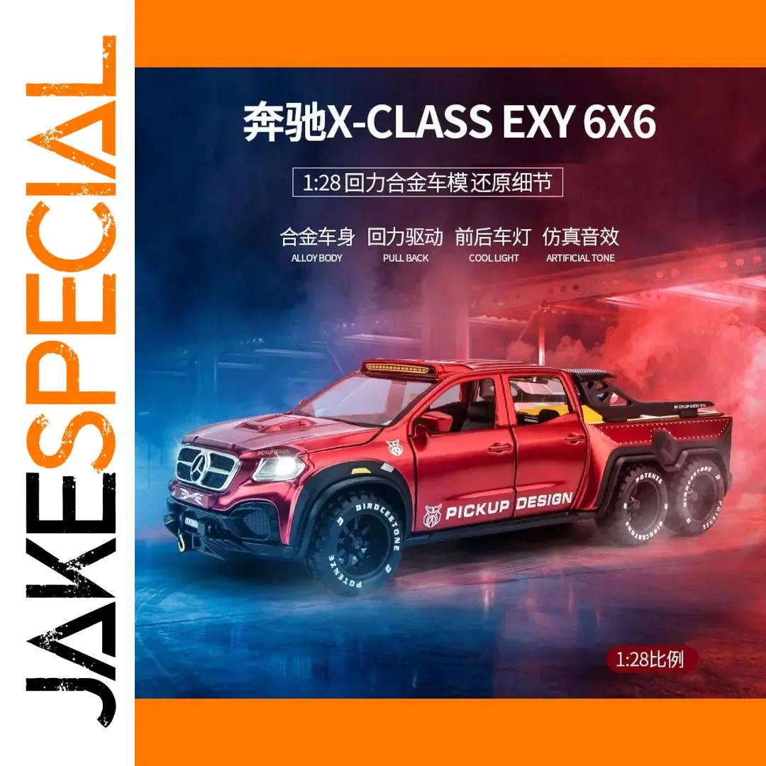 Imagine adding this impressive 1:28 scale diecast model of the Mercedes-Benz X-Class Exy 6×6 off-road truck to your collection. Crafted from high-quality alloy, this robust vehicle features a striking red finish that captures attention instantly. The model boasts a realistic grille with the iconic three-point star, detailed hood with simulated vents, and subtle panel lines that mirror the real vehicle's rugged design. Its large, textured black tires with prominent treads and white lettering give it an aggressive off-road look. Enhanced with functional roof-mounted LED lights and a rear spoiler, the model exudes durability and adventure. With sound and lighting effects, it sparks imagination, making you feel as if you’re behind the wheel on a daring off-road trail.