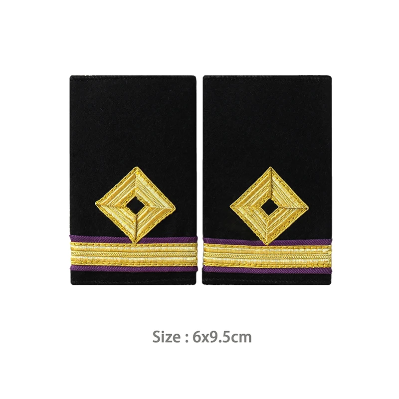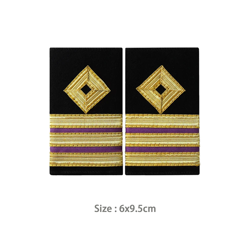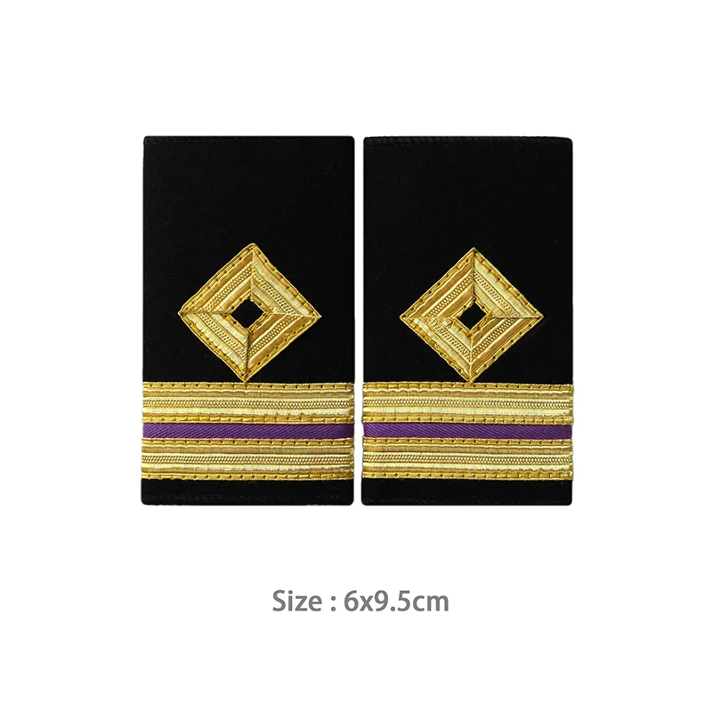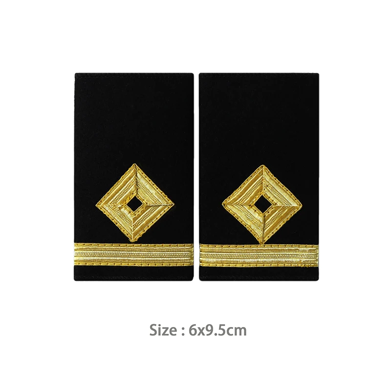 The Merchant Marine Epaulette Bullion Braid set is an exquisite collection designed for those in the maritime profession. Featuring a solid black base made from slightly textured fabric, this set showcases an array of visually striking patterns. The luxurious gold bullion braid, with its intricate stripes, geometric shapes, and central diamond accents, adds a formal touch that speaks to its rank-denoting purpose. Tailored for both men and women, the epaulettes are available in various colors corresponding to specific marine roles, making them ideal for officers and cadets alike. This blend of tradition and novelty exemplifies the dedication to maritime craftsmanship.