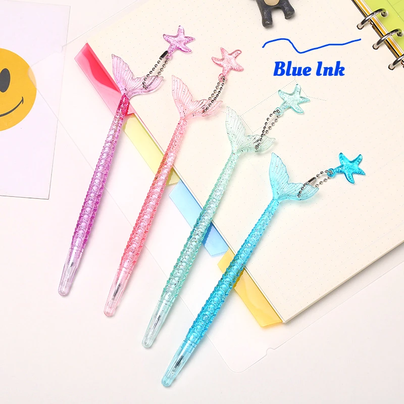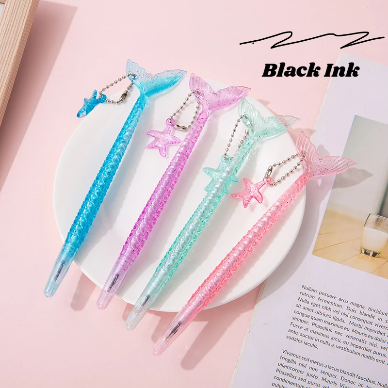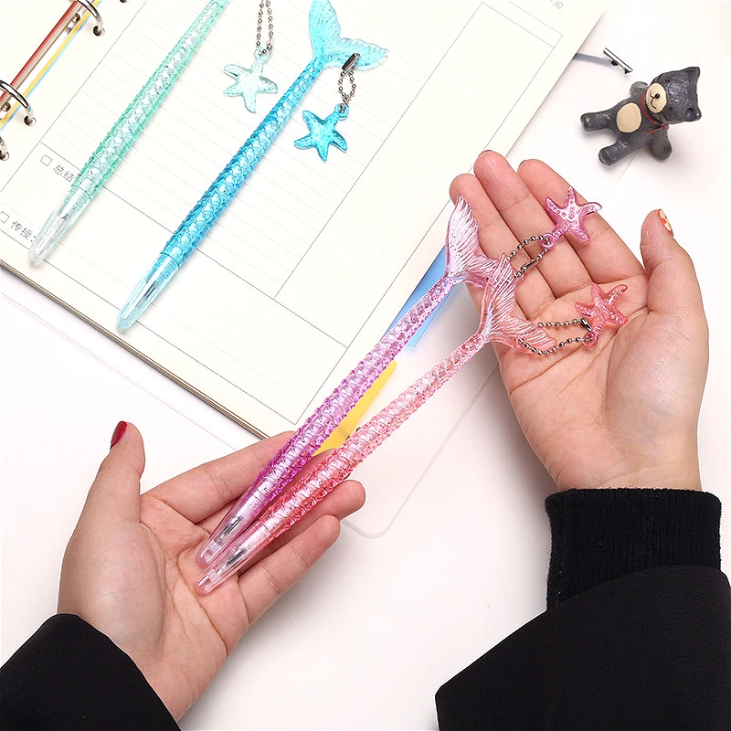 - Decorative charms in pastel colors shaped like mermaids, starfish, and shooting stars are attached with small metal chains, adding playful aesthetic appeal to each pen.
