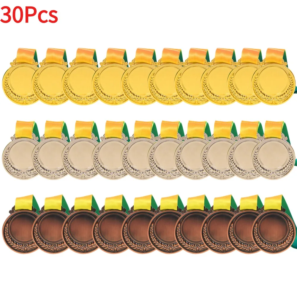 Elevate your recognition events with this exquisite set of metal award medals, available in packs of 10, 20, or 30 pieces. Each medal showcases striking colors including gold, silver, and bronze, set in a circular design measuring about 5.2 cm (2″) in diameter. Crafted from high-quality metal with gold, silver, and copper plating, they exhibit a dual-sided design that enhances their visual appeal. Paired with a vibrant blue-green gradient neck ribbon, these medals not only symbolize achievement but also make for thoughtful gifts, perfect for sports competitions, academic awards, or any event celebrating excellence.