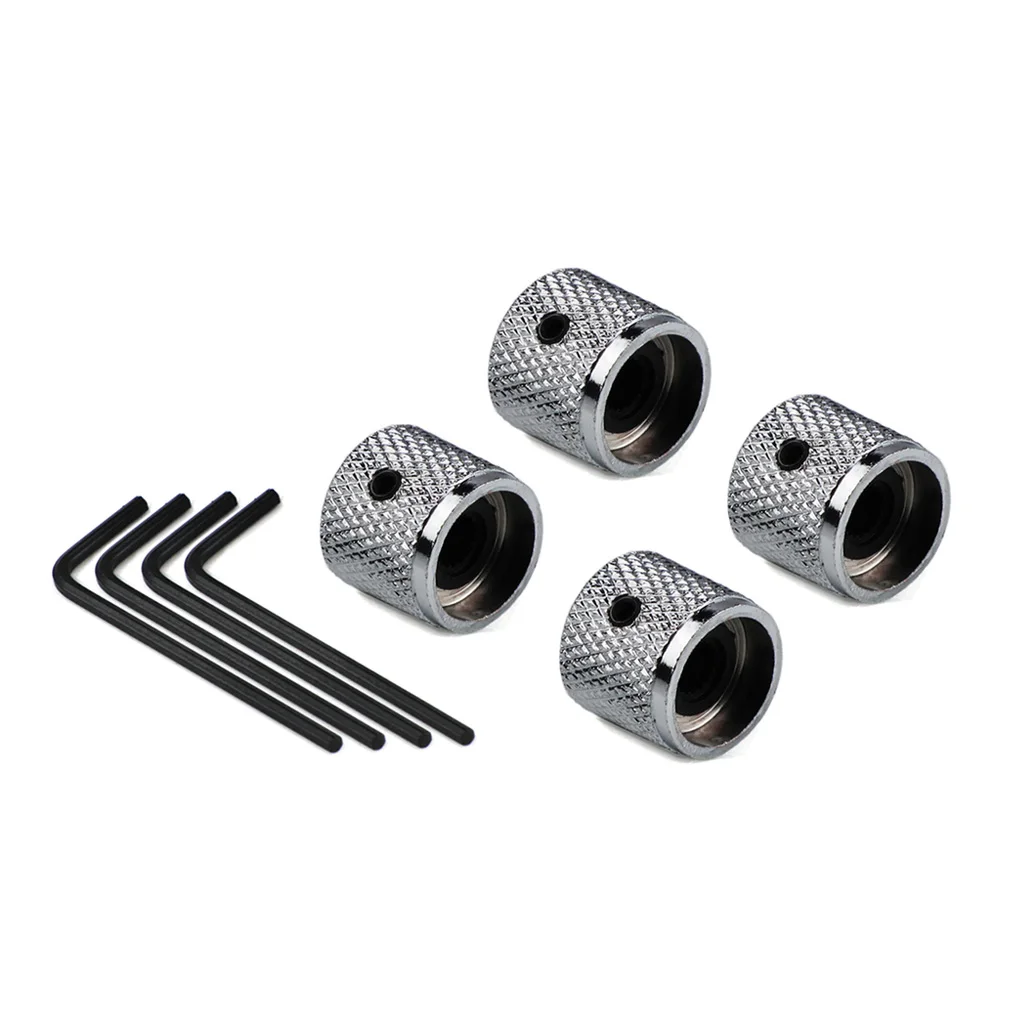 Enhance your electric guitar’s control panel with this set of four durable metal dome-top bass control knobs, each approximately 18mm in diameter and 18.3mm tall, featuring a 6mm hollow shaft compatible with most potentiometers. Available in sleek chrome or matte black finishes, you can choose between two chrome and two black, four black, or four chrome options to suit your aesthetic. The knobs feature a knurled side texture for secure grip and include a small wrench for effortless installation. Crafted from high-quality metal, these stylish and durable knobs offer both functional precision and a modern industrial look to elevate your guitar’s appearance and performance.