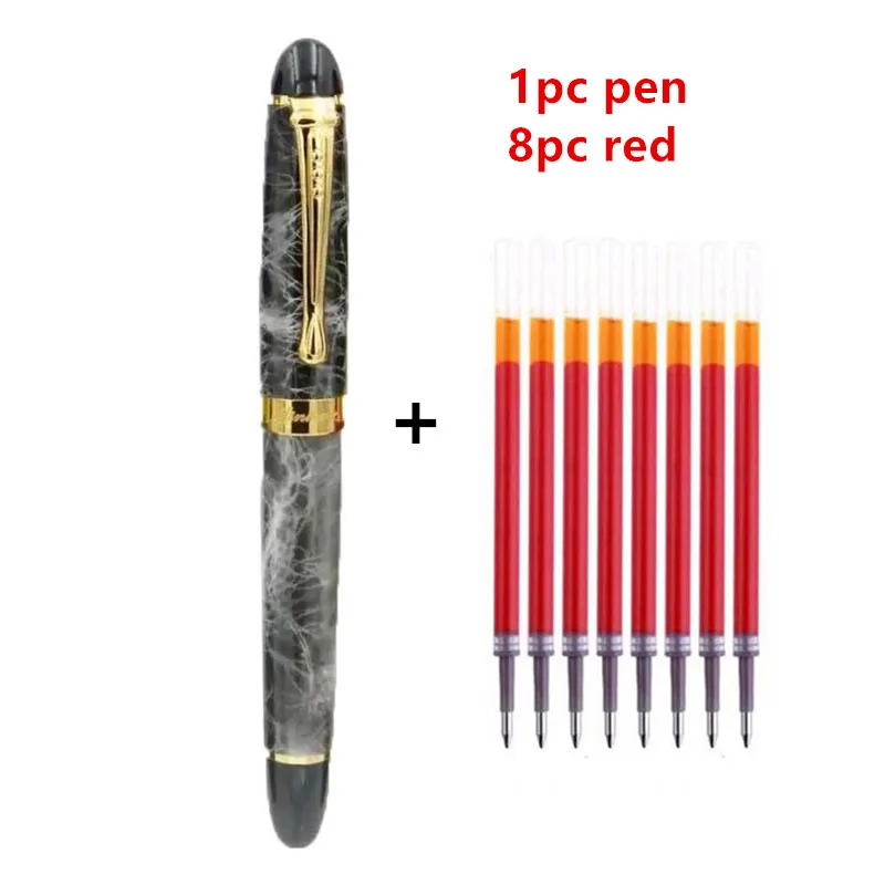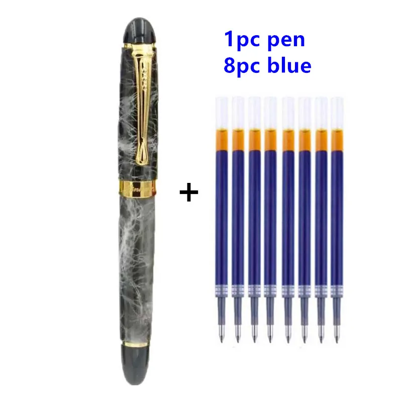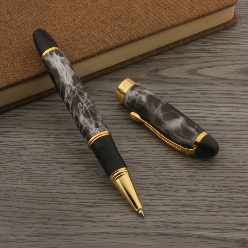 Imagine elevating your writing experience with this sophisticated metal rollerball pen, featuring a sleek, cylindrical body adorned with a marbled black and gray pattern. Its glossy finish radiates luxury, while the gold-colored accents—like the band near the top and the stylish clip—add a refined touch. The rounded black cap complements the professional look, making it perfect for office and school environments. Whether signing important documents or jotting down quick notes, this pen offers a reliable and smooth flow of ink through its 0.5mm bullet tip, promising precise and consistent writing every time. The set includes one elegant pen and eight refill cartridges, ensuring you're always ready for any writing task with style and confidence.