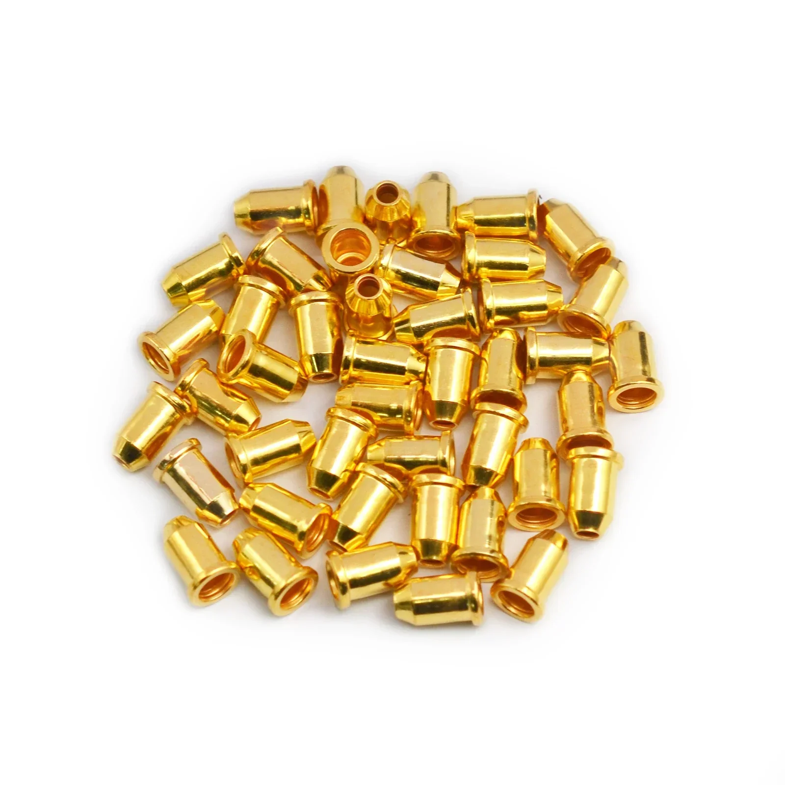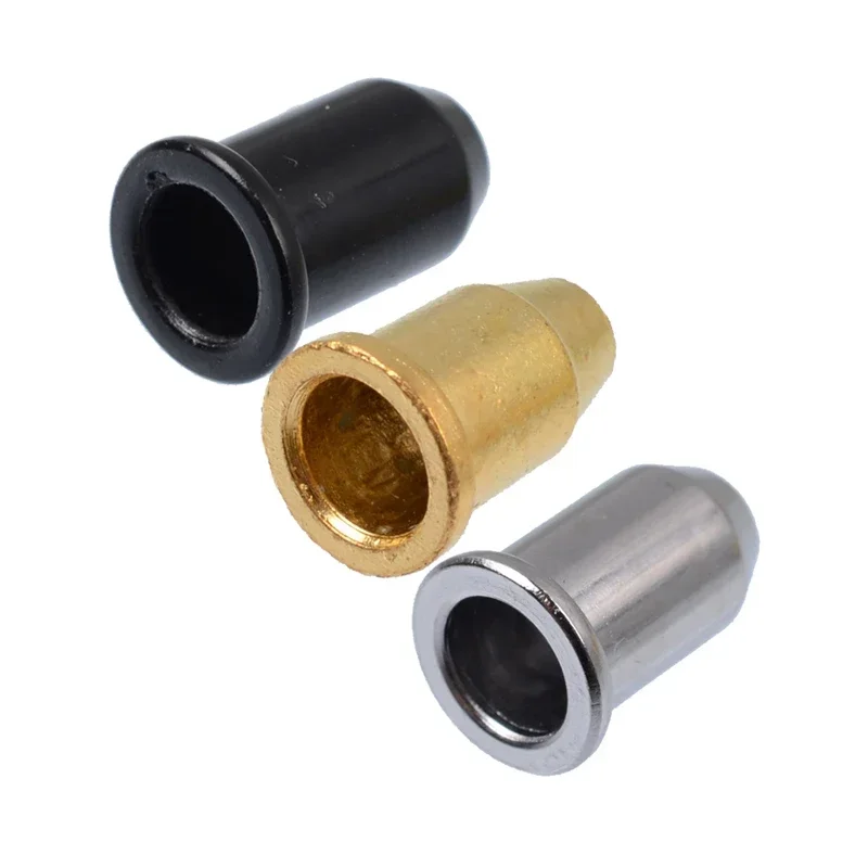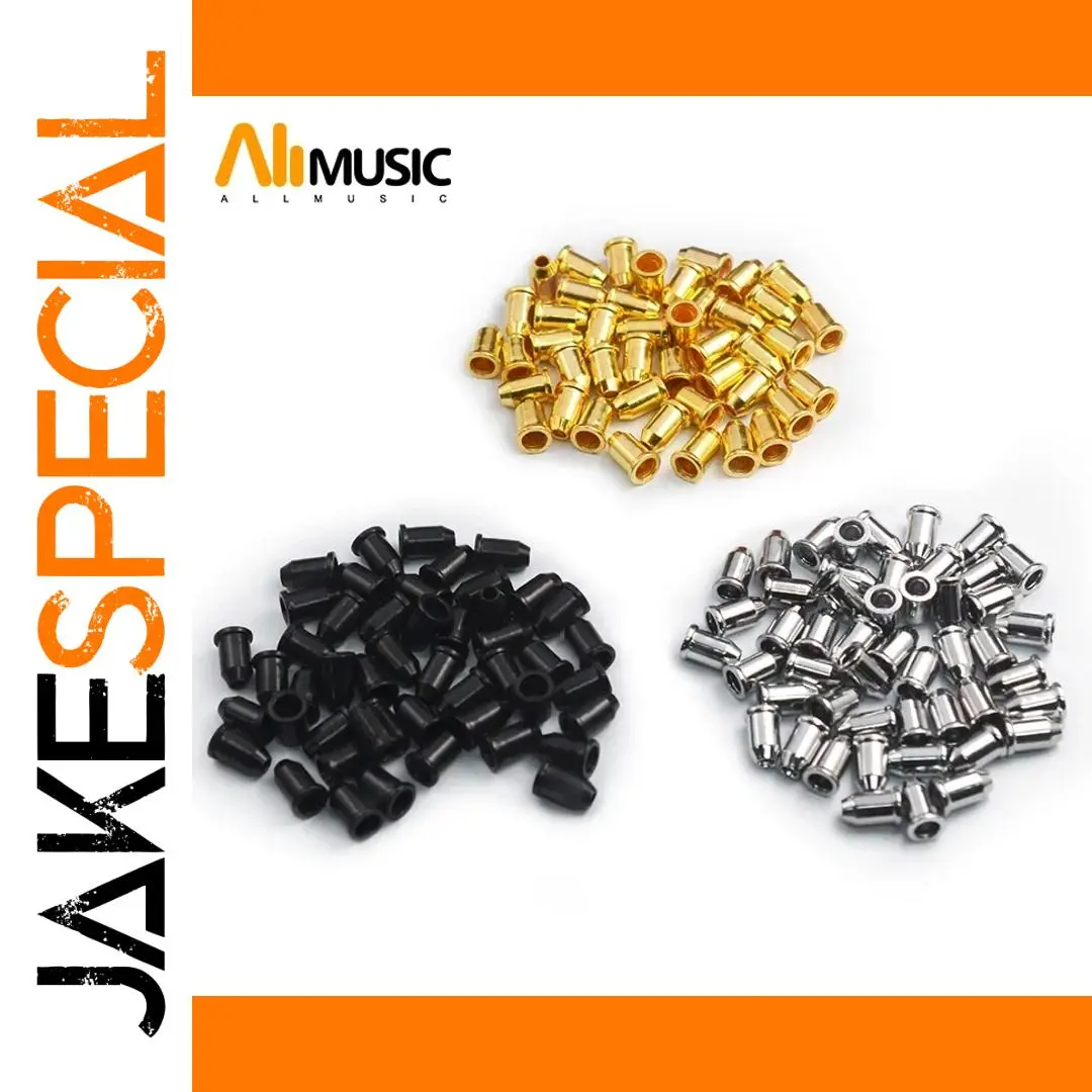 Enhance your electric guitar maintenance with this set of 100 high-quality metal mounting ferrules designed as bridge string retainers. Available in three sleek colors: shiny chrome silver, matte black, and luminous gold, each ferrule features a uniform cylindrical shape with a hollow center, measuring dimensions shown in the image for precise fit. Crafted from durable, chemical-free metal, these ferrules ensure long-lasting performance and seamless installation for various electric guitar bridge models. Perfect for repair or customization, this set offers a reliable, stylish solution to keep your guitar sounding and looking superb.