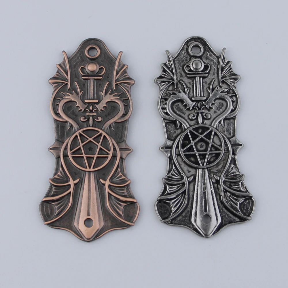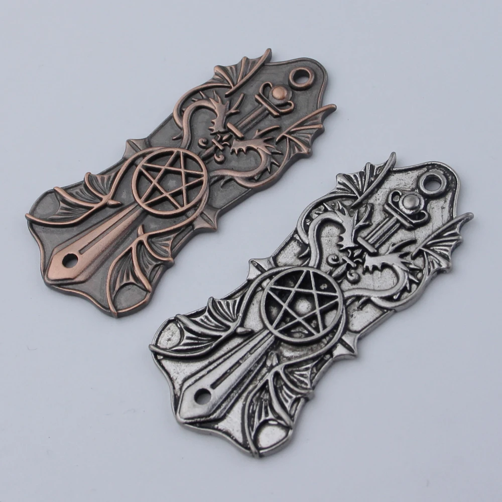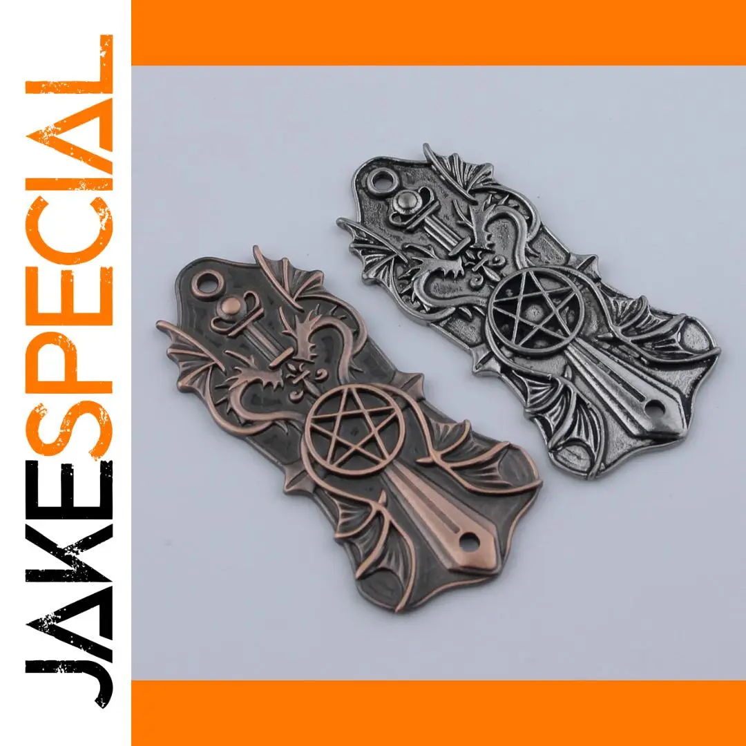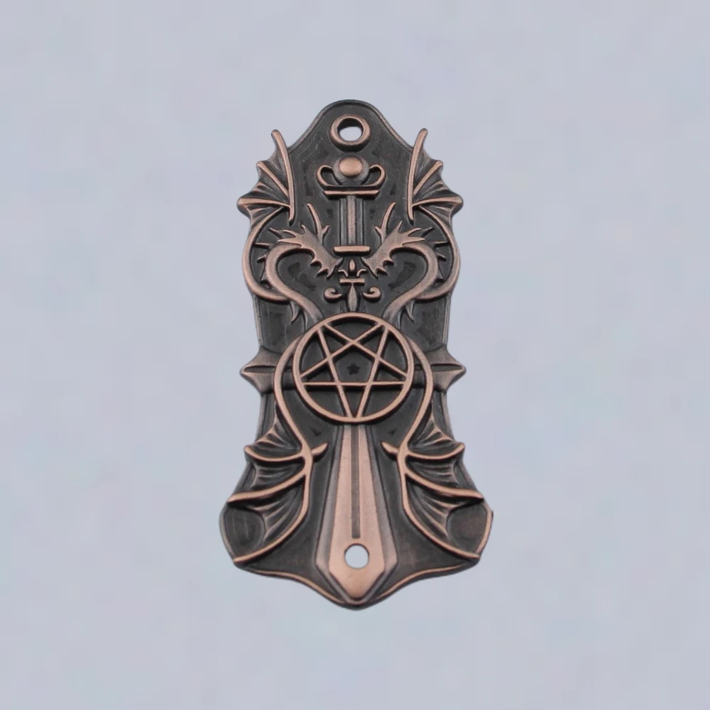 Elevate the look of your LP Standard or SG guitar with this stunning Metal Guitar Front Cover Set. Featuring a rich copper finish on one cover that gleams with a metallic shine and an elegant muted silver-gray on the other, these covers are designed to captivate any audience. The intricate pentagram motif surrounded by ornate floral patterns adds a touch of artistry, while the rounded edges ensure comfort and compatibility. Made from durable metal, this set promises long-lasting use, making it an ideal choice for musicians seeking to personalize their instruments with unique aesthetics and visual flair.