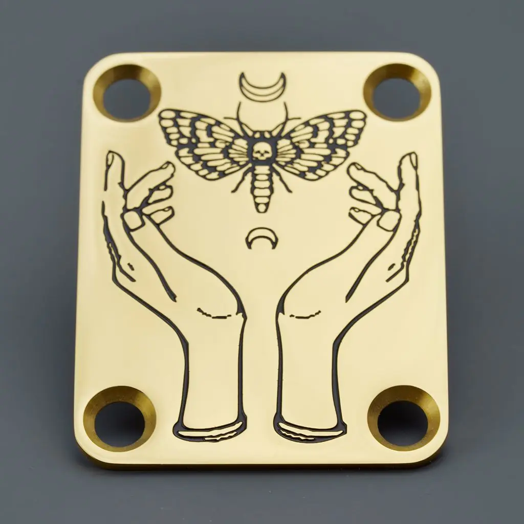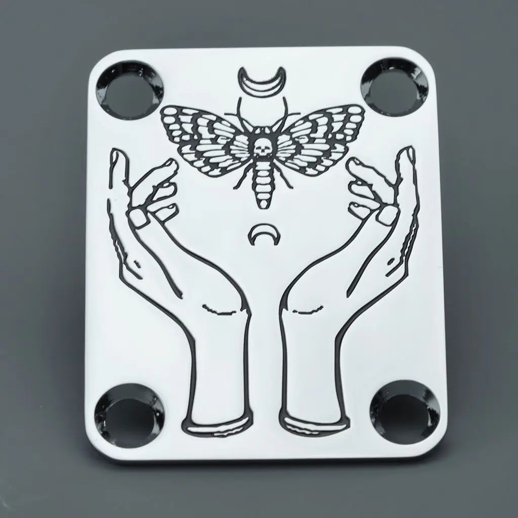 Experience the allure of this this metal guitar neck plate, model GN004, designed to enhance your electric or bass guitar with its artistic engraved motif. Crafted from durable metal, it features a sleek, square shape with rounded corners to seamlessly fit the neck joint area. Available in three stunning finishes—silver chrome, matte black, and luxurious gold—each provides a unique aesthetic while protecting and stabilizing your guitar’s neck. The detailed engraving depicts a mystical scene with a moth at the top center, two outstretched hands beneath, and crescent moons framing the composition, creating a captivating celestial theme. Its fine engraved lines add delicate contrast, highlighting the craftsmanship. Elevate your instrument’s visual appeal with this carefully designed and versatile accessory that combines artistry with functionality.