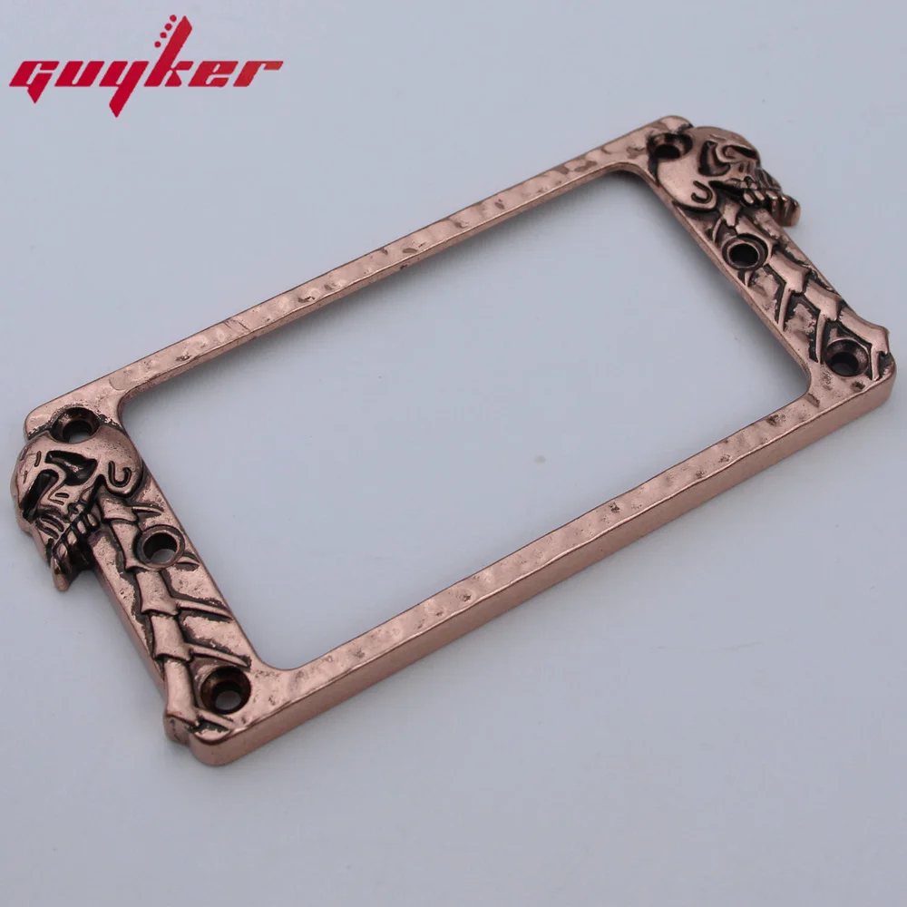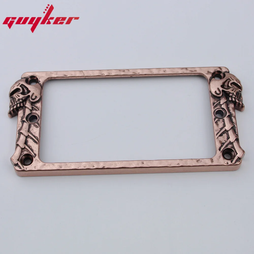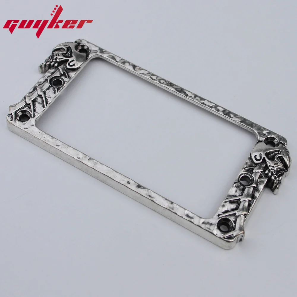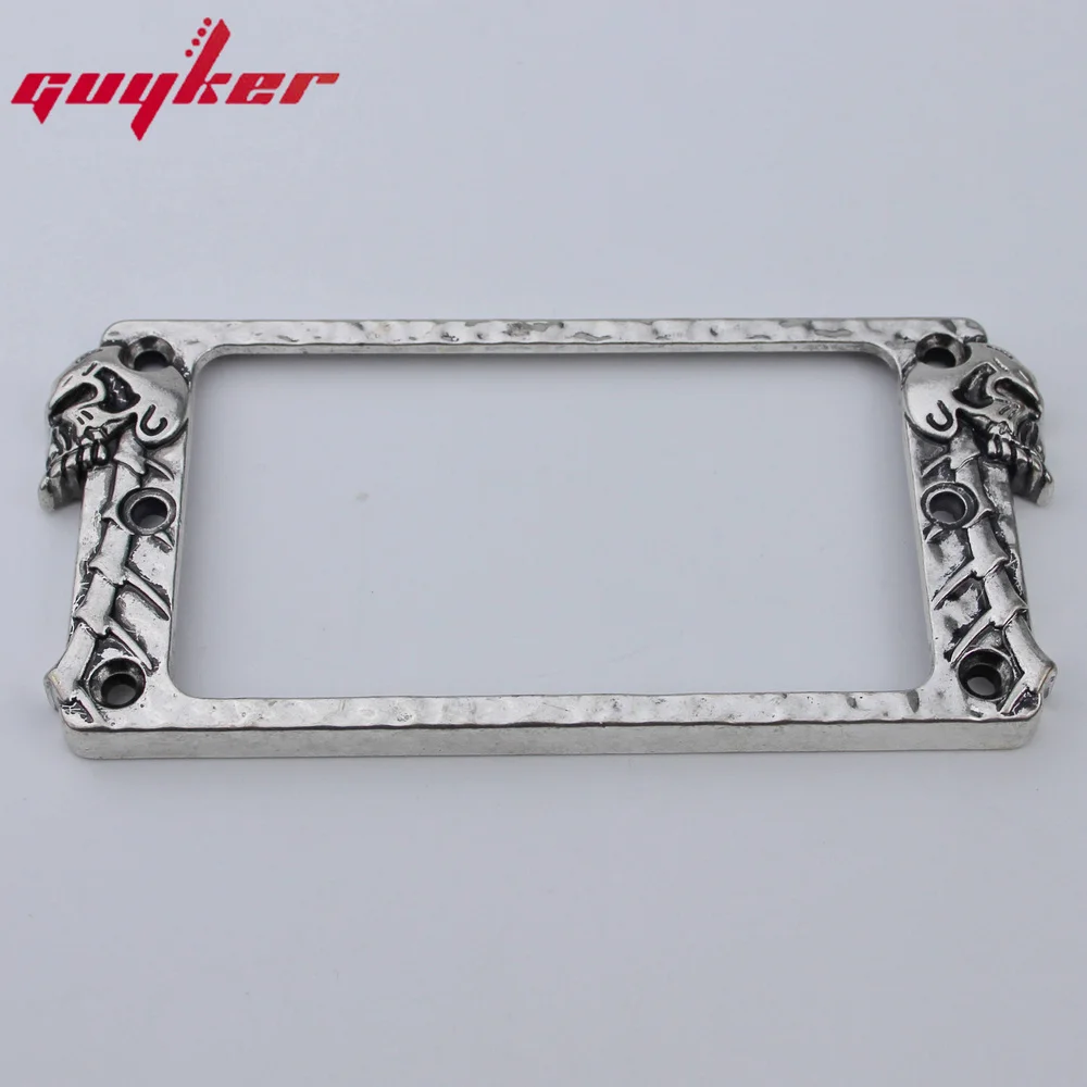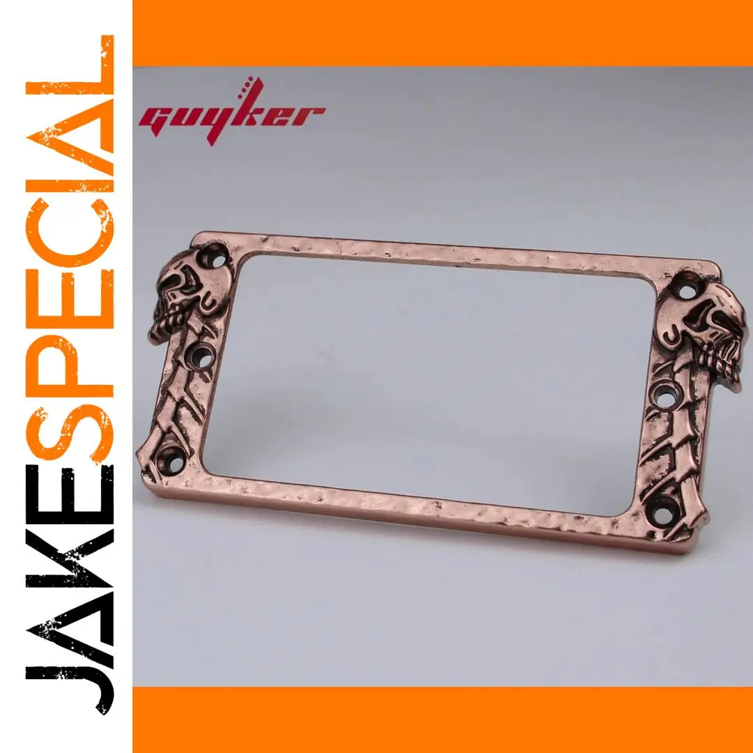 Enhance your electric guitar's aesthetic with this high-quality metal pickup mounting ring, designed for humbucking pickups. Crafted from durable metal, it offers a rugged, vintage look with a slightly distressed finish that complements any guitar style. Available in sleek black or antique chrome, this ring features an embossed skull design at each corner, giving it an edgy, industrial vibe. Its rectangular shape with a flat bottom is ideal for replacing worn or broken pickup rings, instantly elevating your instrument’s appearance. Built to resist deformation, this sturdy component is a perfect addition for both functional upgrades and creative customization. Please note, mounting screws are not included, allowing you to choose your preferred hardware for installation.