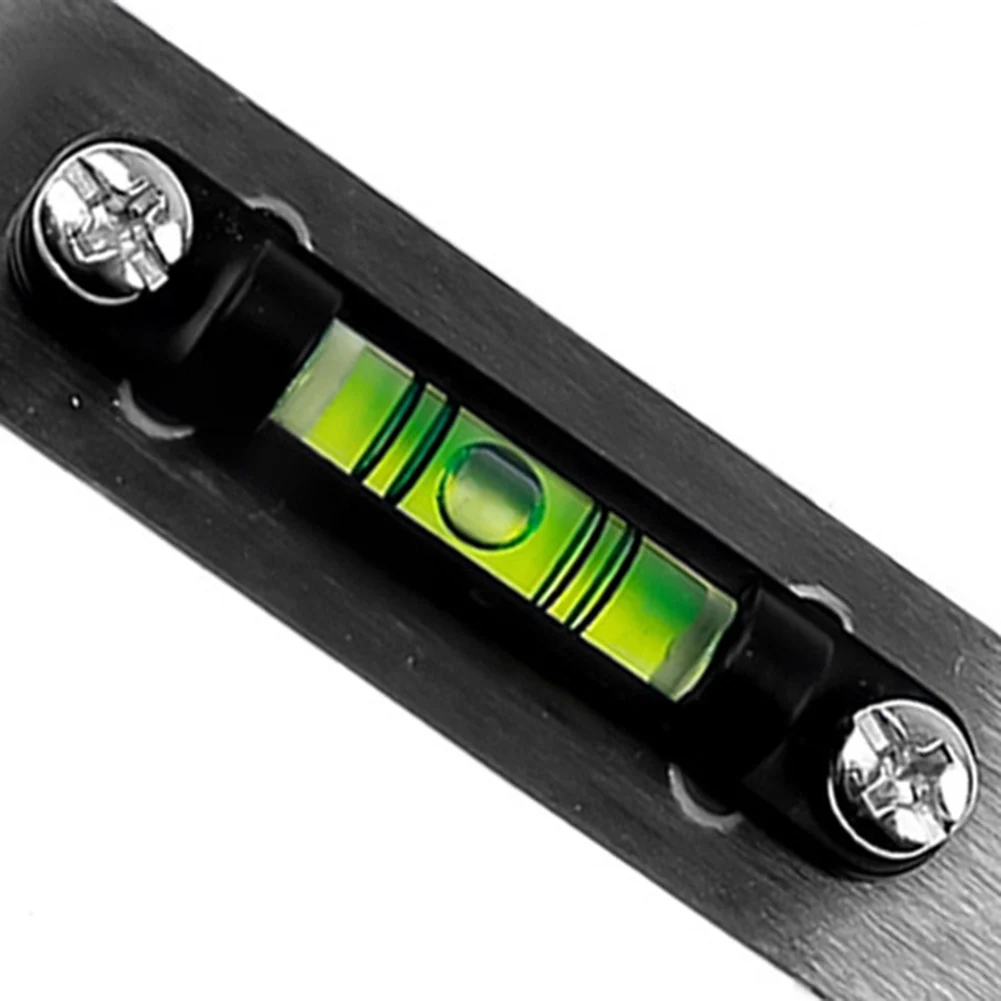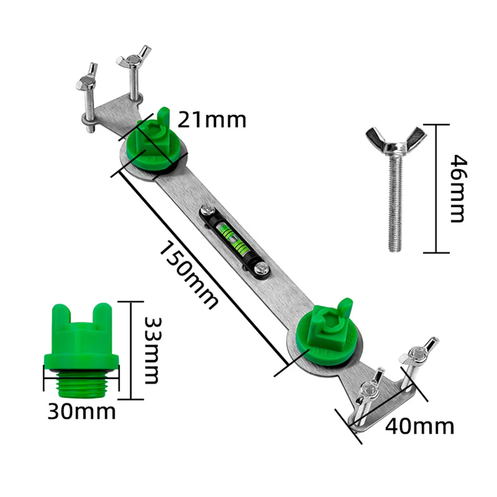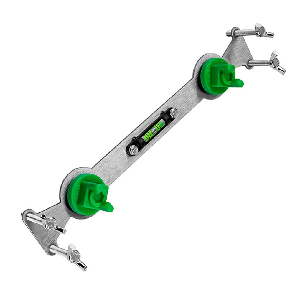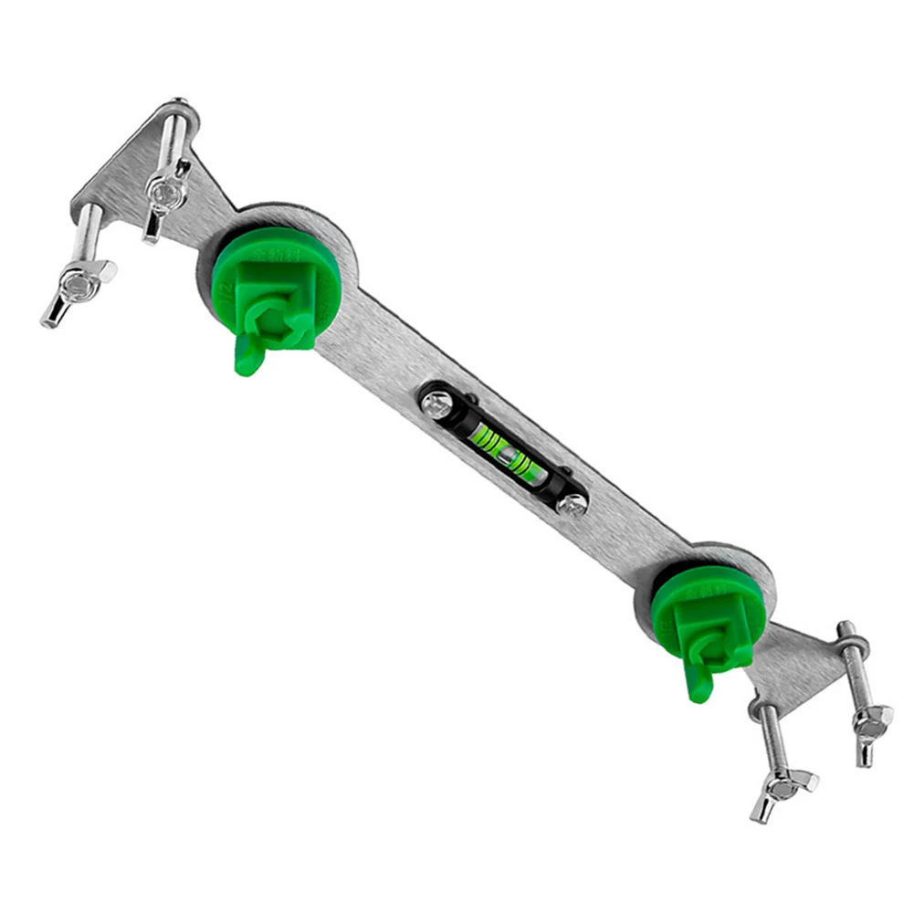 This durable metal pipe leveler features an integrated horizontal bubble level for precise alignment of plumbing fixtures such as showerheads, faucets, valves, and hoses. Crafted with a shiny, industrial-style metallic finish, it includes green plastic adjustment components at each end for secure positioning and an ergonomic handle for effortless use. Equipped with an adjustable screw mechanism and a clear level gauge, this tool ensures accurate wall distances and perfect horizontal alignment. Ideal for both professional plumbers and DIY enthusiasts, it combines robust construction with functional design, making installation tasks faster, more accurate, and more efficient.