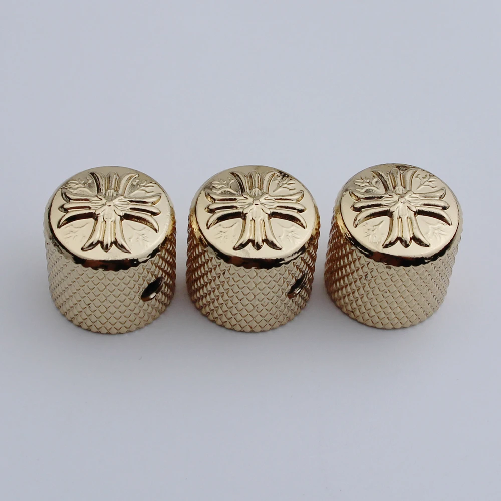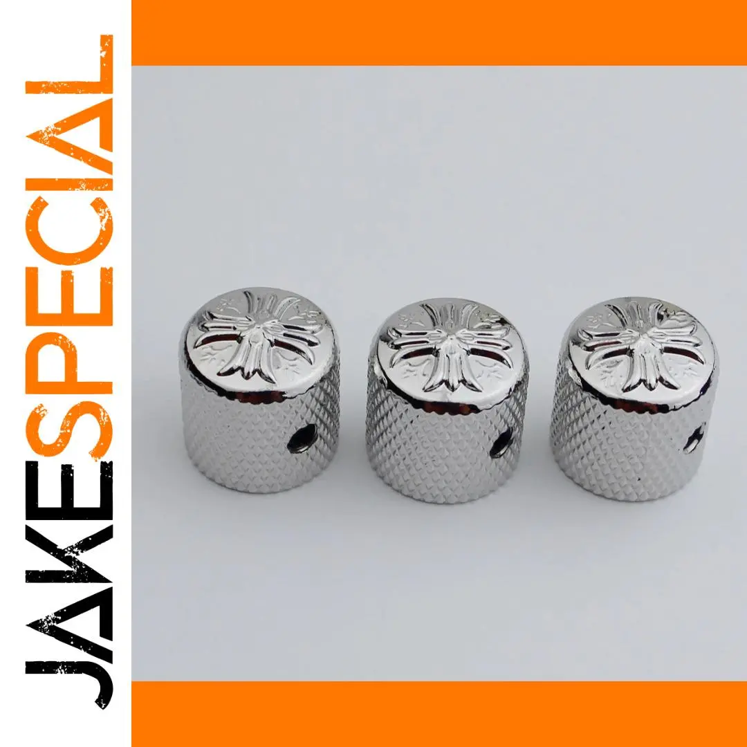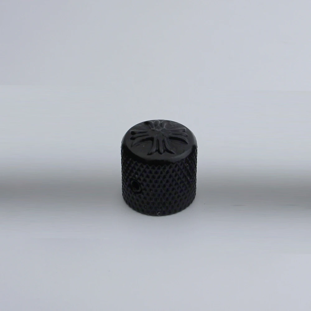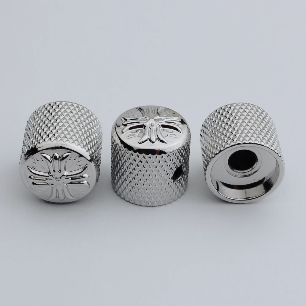 Enhance your electric guitar or bass with this set of metal potentiometer knobs featuring a sleek cruciform surface and an inner diameter of 6mm. Available in black, chrome, or gold finishes, each knob offers a polished, reflective look with an ornate, embossed design on the top surface and a textured diamond-patterned grip on the sides for easy control. Designed for compatibility with instruments that have a 6mm shaft diameter, these durable, vintage-inspired knobs are perfect for replacing or upgrading existing control components, adding both style and functionality to your musical setup. Choose from 1 or 3-piece sets to suit your needs.
