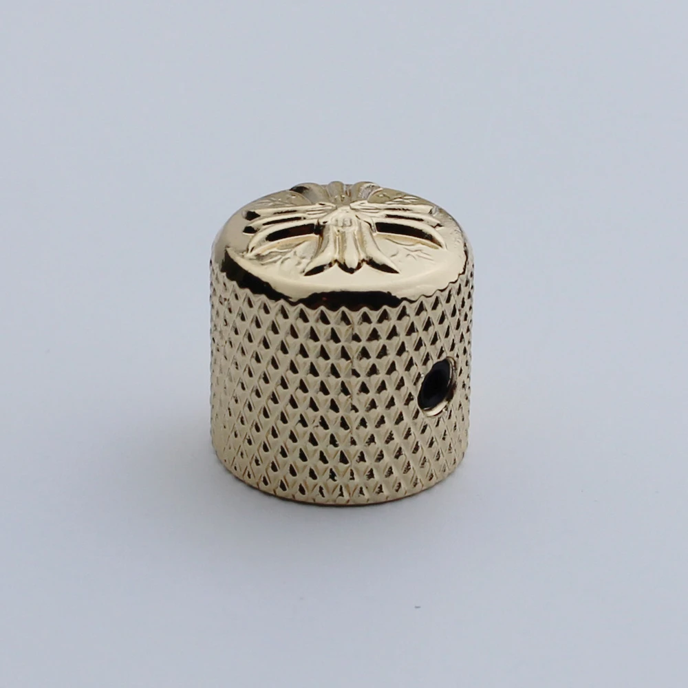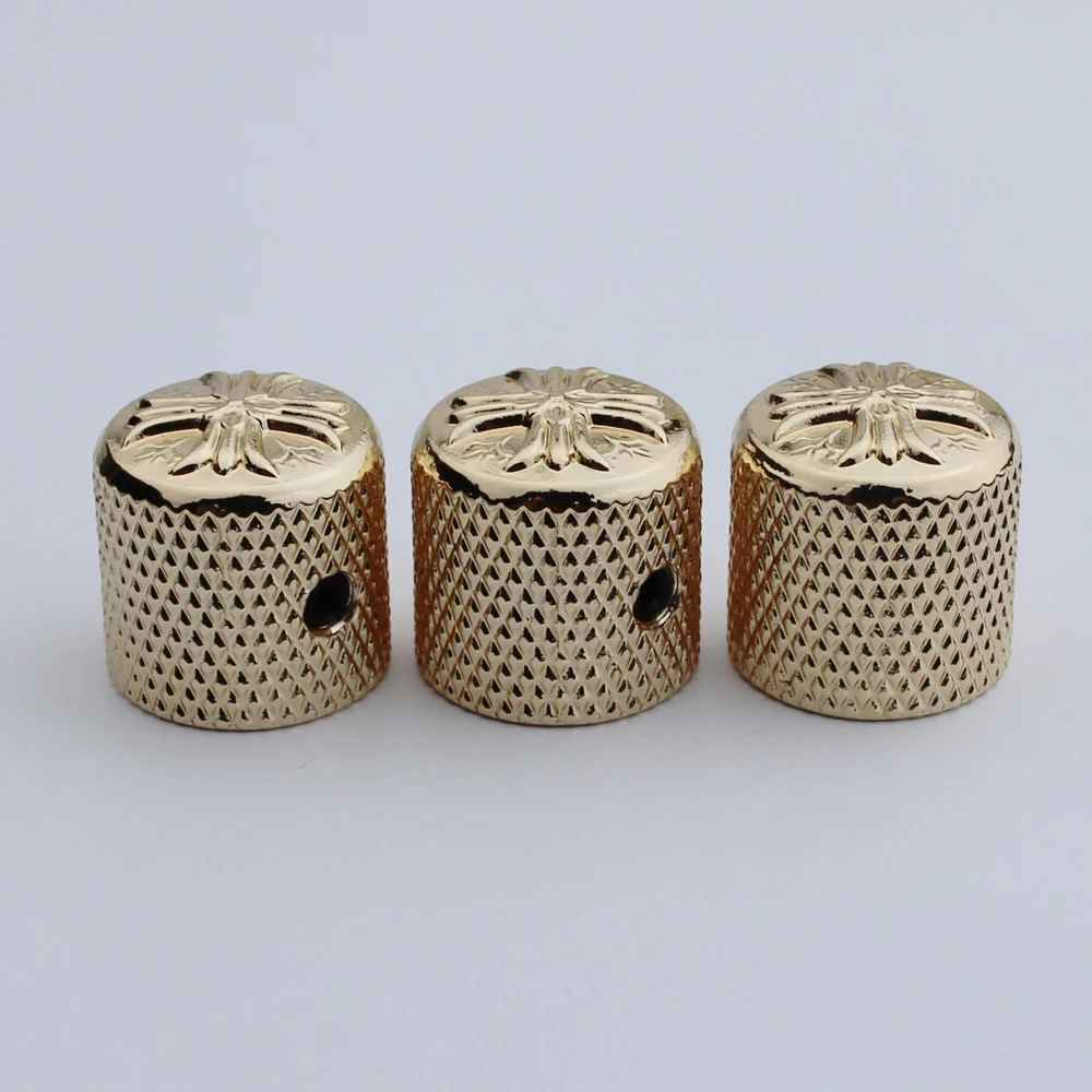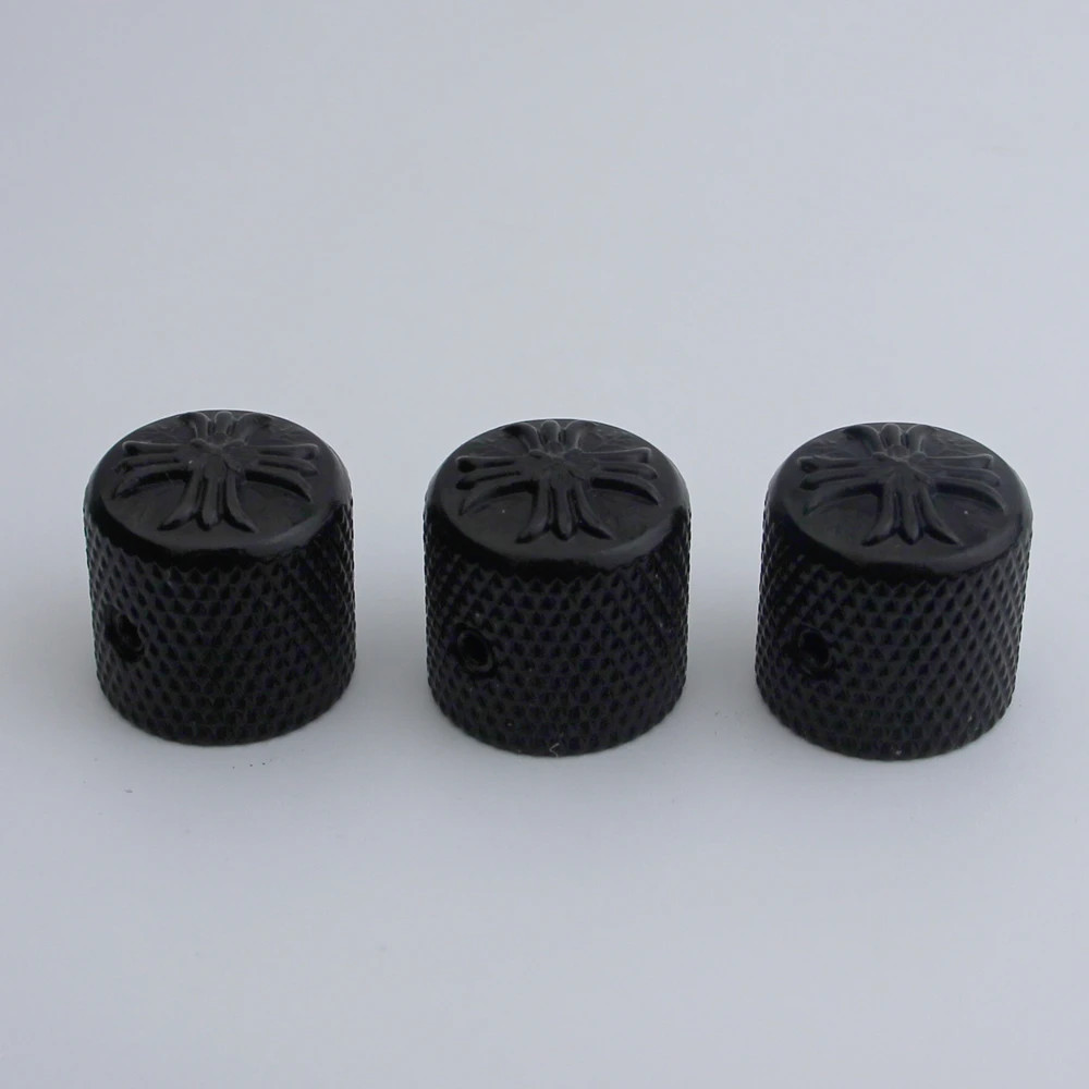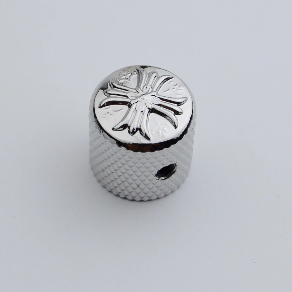 Enhance your electric guitar or bass with this set of metal potentiometer knobs featuring a sleek cruciform surface and an inner diameter of 6mm. Available in black, chrome, or gold finishes, each knob offers a polished, reflective look with an ornate, embossed design on the top surface and a textured diamond-patterned grip on the sides for easy control. Designed for compatibility with instruments that have a 6mm shaft diameter, these durable, vintage-inspired knobs are perfect for replacing or upgrading existing control components, adding both style and functionality to your musical setup. Choose from 1 or 3-piece sets to suit your needs.