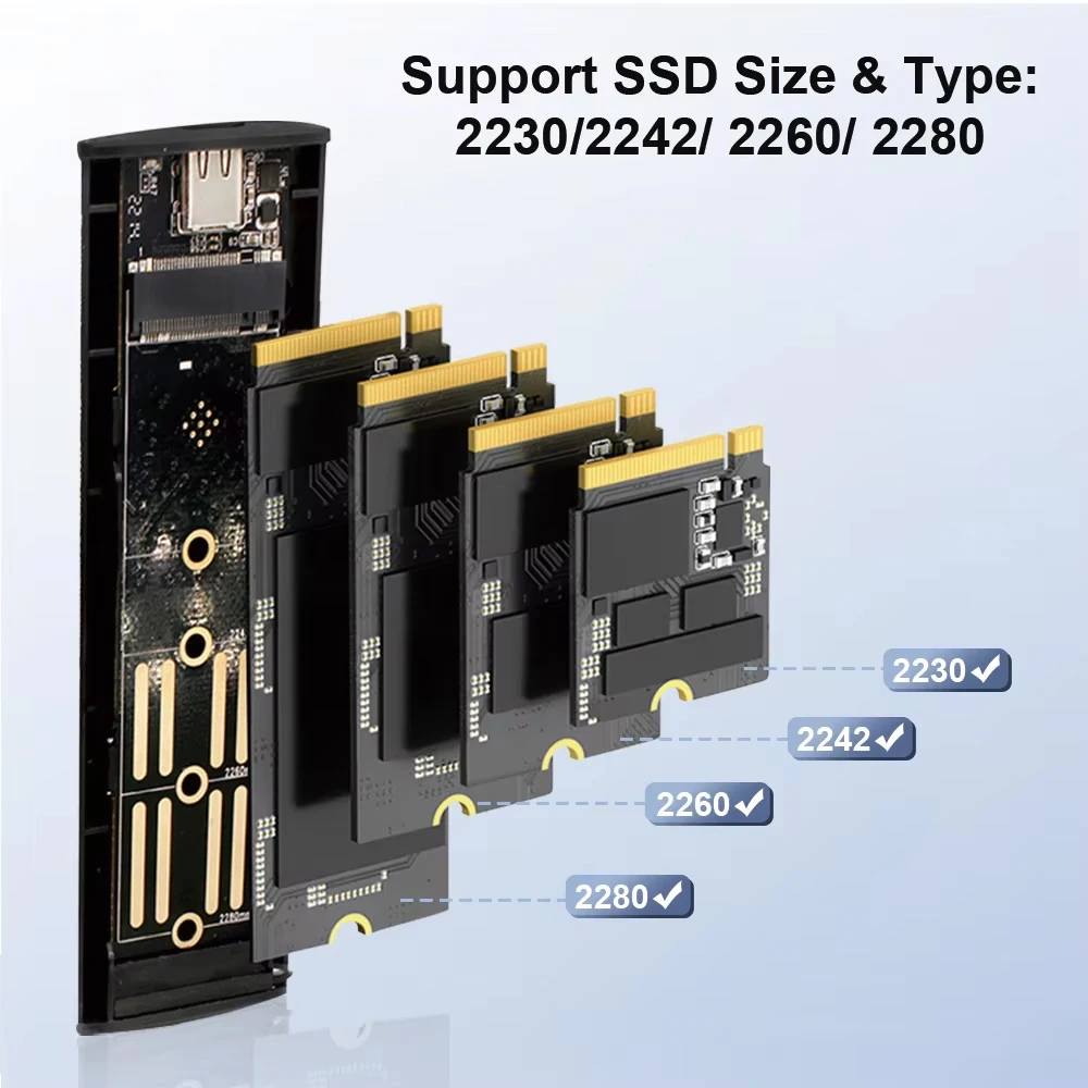 - Compatible with M.2 drives in sizes 2230, 2242, 2260, and 2280, supporting drives up to 4TB capacity, making it versatile for various storage needs.