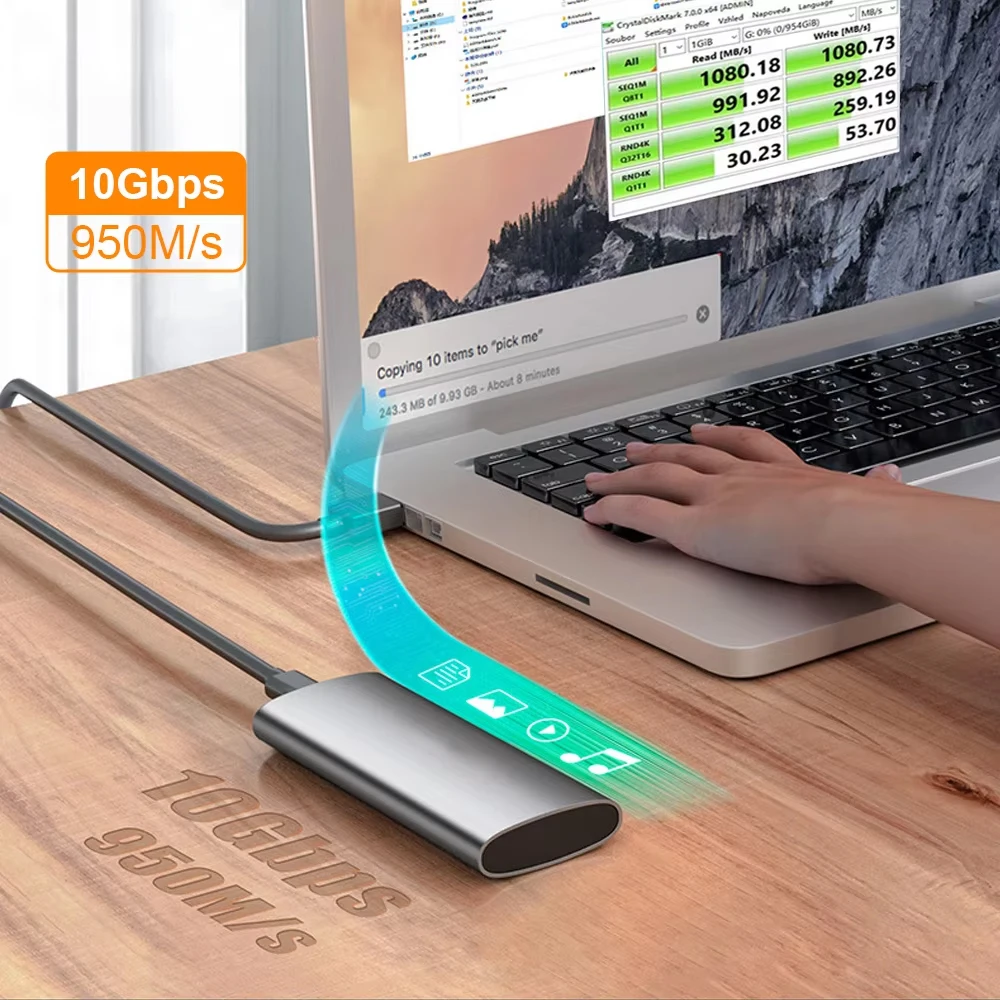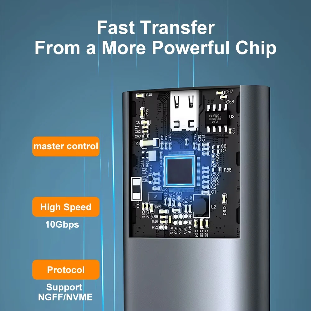 - Supports NVMe and SATA protocols with transfer speeds up to 10Gbps and 5Gbps, ensuring ultra-fast data exchanges for professional and personal use.