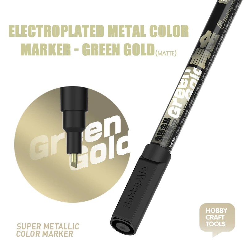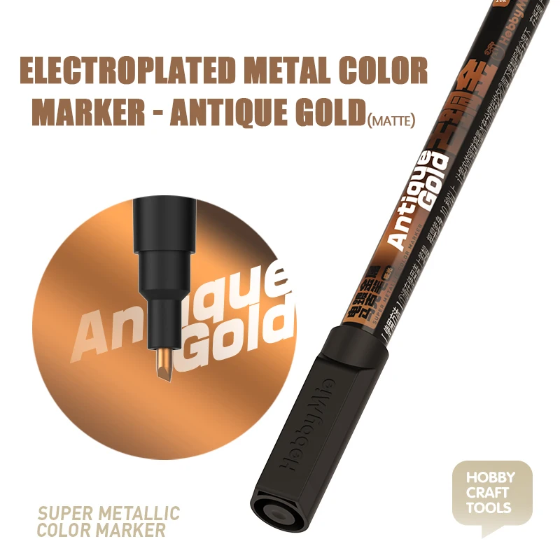 The HM-JX metallic color marker is a high-quality hand tool designed for precise application on plastic model kits, offering stunning electroplated metallic finishes in shades such as Antique Gold, Green Gold, Knight Gold, Red Gold, Rose Gold, and Silver. Featuring a sleek, durable plastic body with a 10ml silver refill option, this oil-based paint pen ensures smooth, even coverage with a lustrous, reflective appearance. Ideal for DIY enthusiasts, it allows modelers to easily achieve professional-grade metallic effects on detailed surfaces, enhancing the realism and aesthetics of your projects with its vibrant, durable metallic sheen.