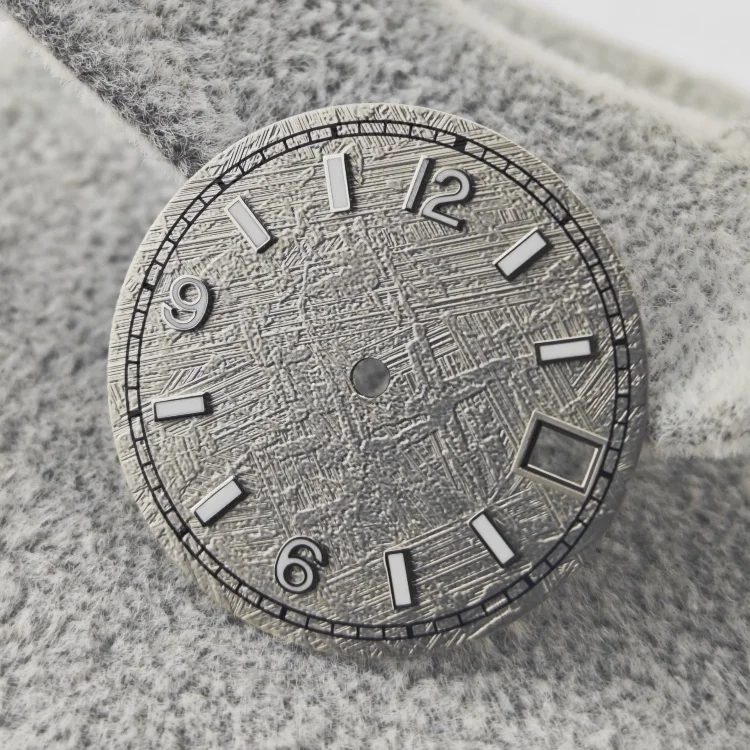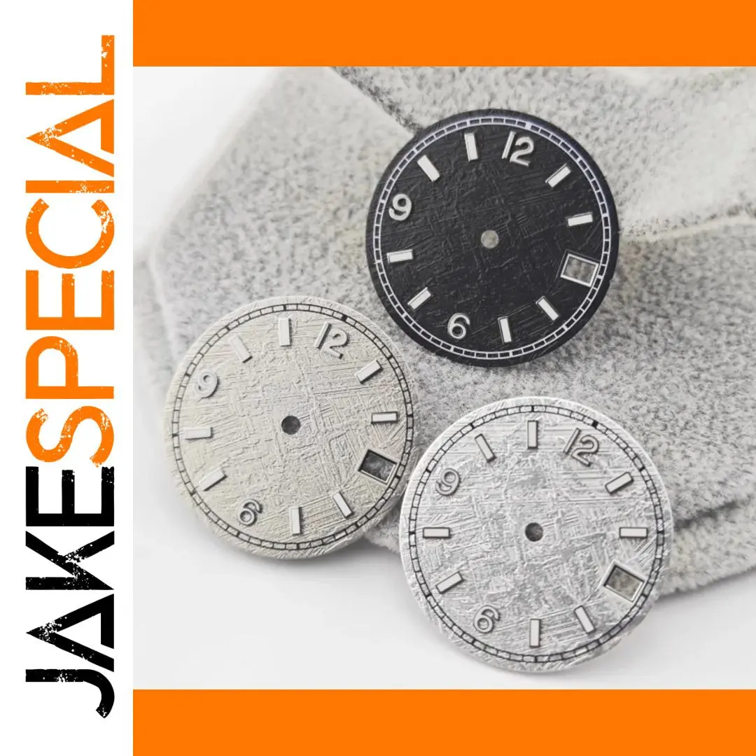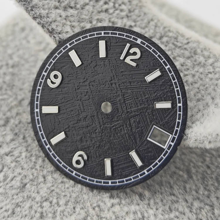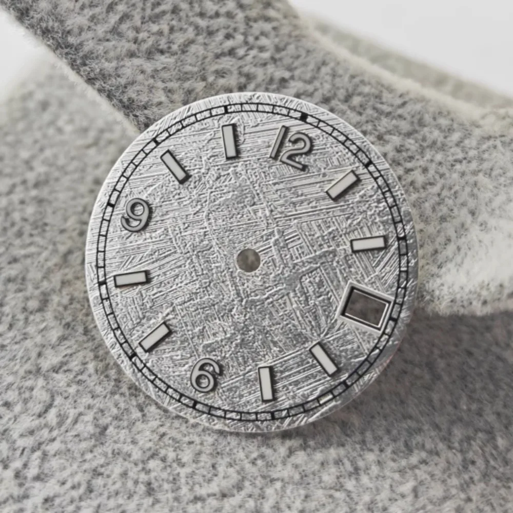 Enhance your self-winding watch with this 28.5mm dial compatible with NH35 and NH36 movements. Featuring a striking meteorite pattern with textured surfaces in black, light gray, or white, it adds a cosmic aesthetic to your timepiece. The dial includes blue luminous accents and BGW9 luminous material for excellent visibility in low light conditions. Its dual digital and analog display design, round stainless steel case, and no-logo style offer a sleek, modern look—perfect for casual and fashion-forward watch enthusiasts. With a foot position of 3.0/3.8, this versatile dial is ideal for creating a distinctive, high-quality watch that stands out.
