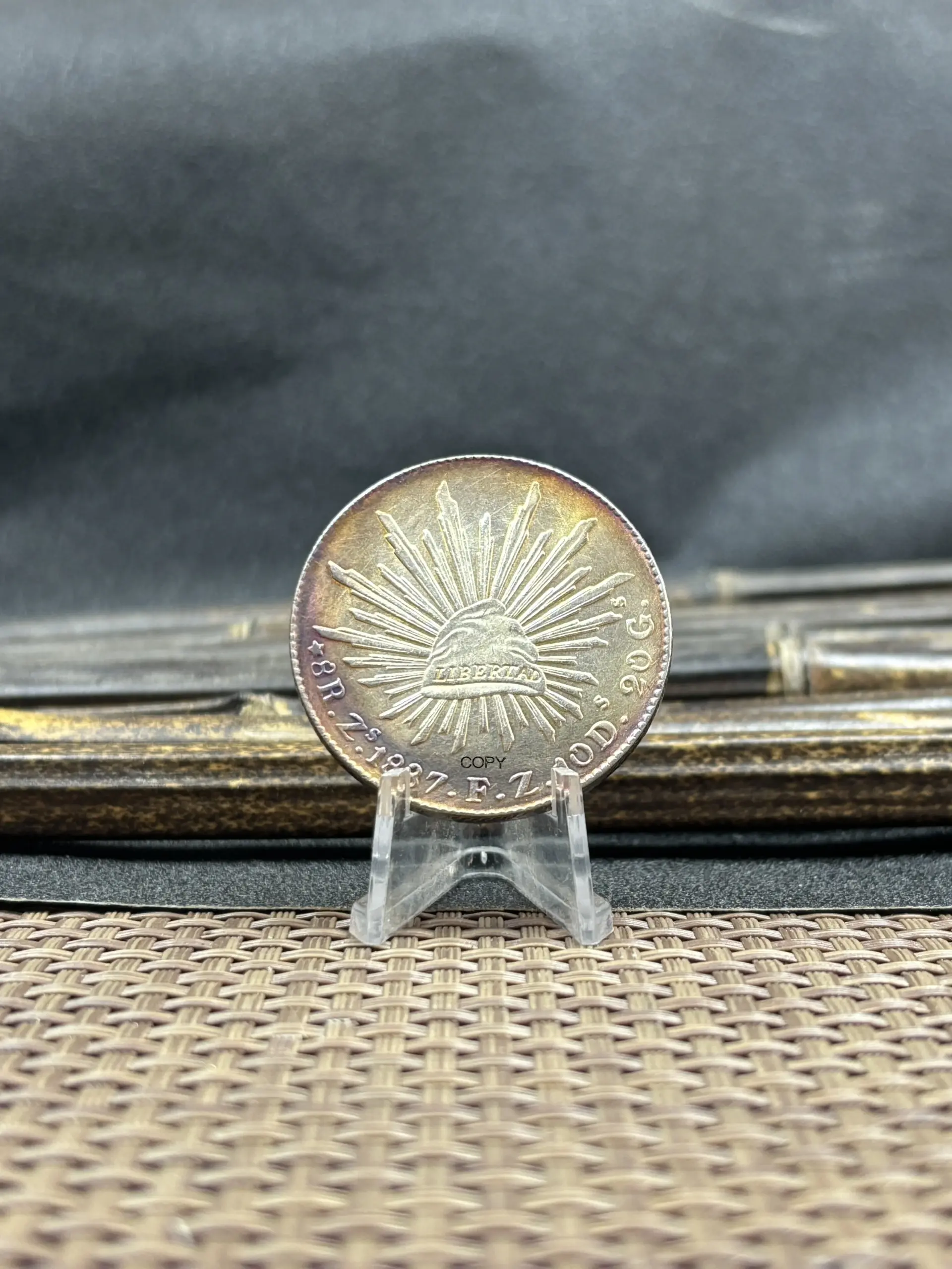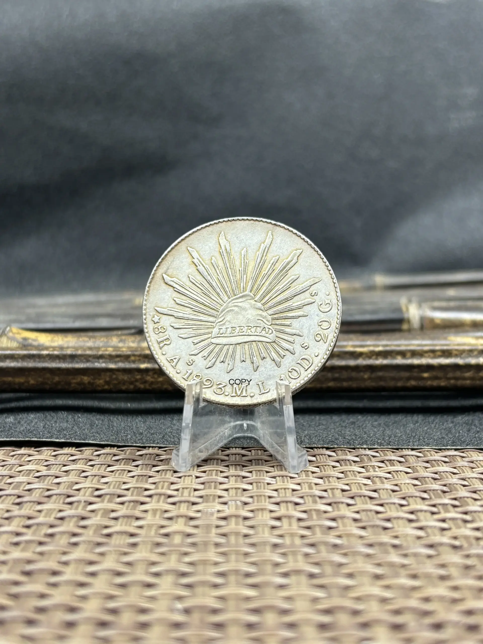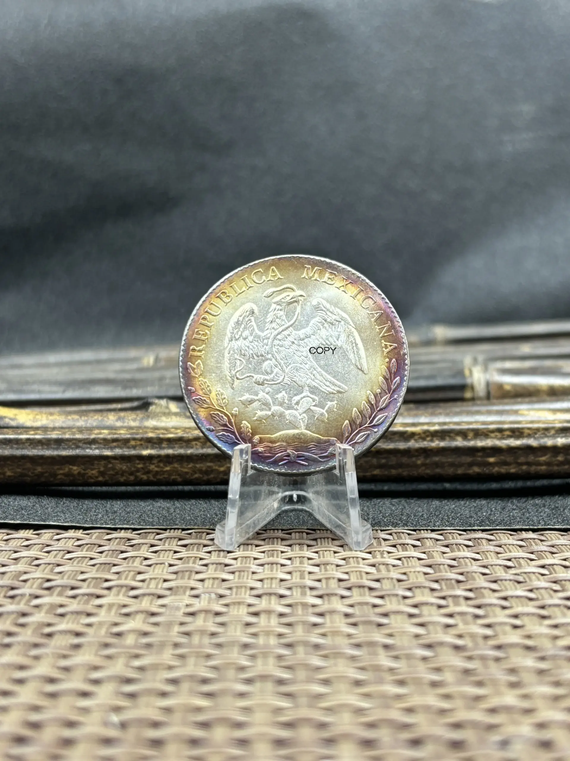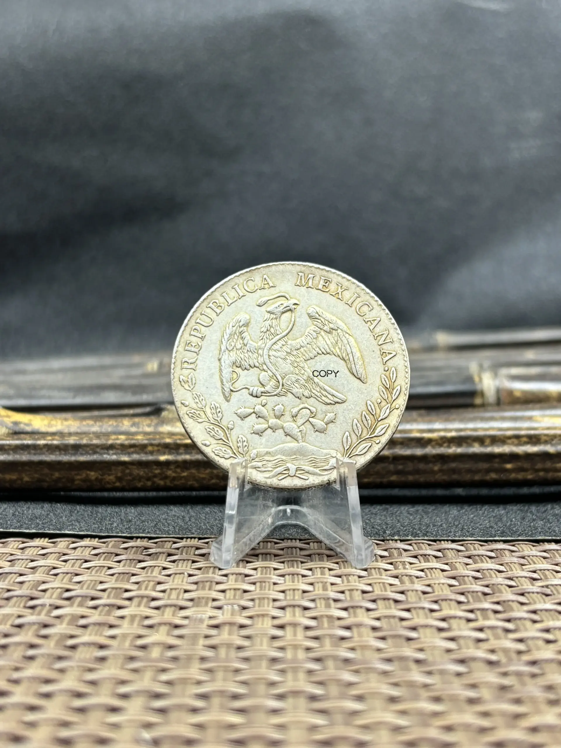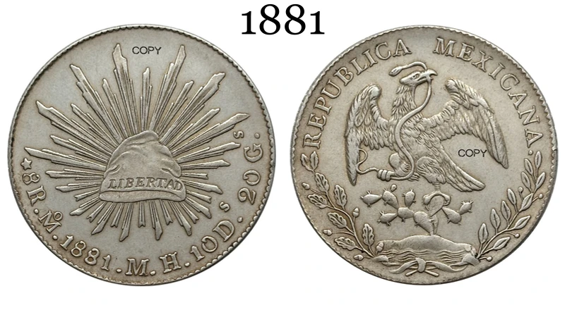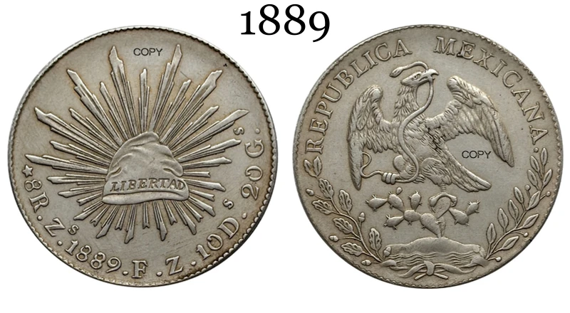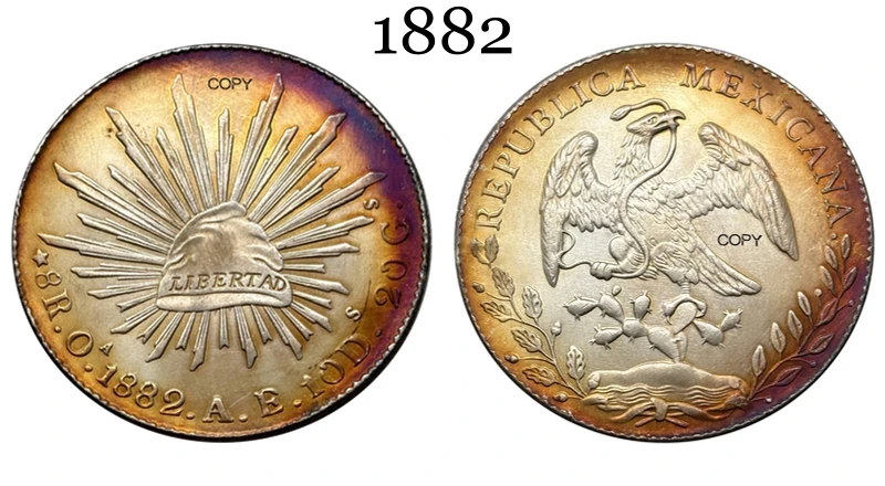 This replica commemorative coin of Mexico features a detailed design with a silver-plated finish, showcasing intricate heraldic symbols from the late 19th century, including the eagle clutching a snake atop a cactus. Available in various years such as 1875, 1881, 1882, 1887, 1889, 1891, 1892, 1893, and 1894, it offers multiple color options including silver, multi-color, and black. Crafted with plating techniques without chemical alteration, this antique-style coin measures approximately 1860-1879 in theme, making it a perfect addition for collectors. Please note, it is an imitation intended solely for collection purposes, with slight variations in color and design.