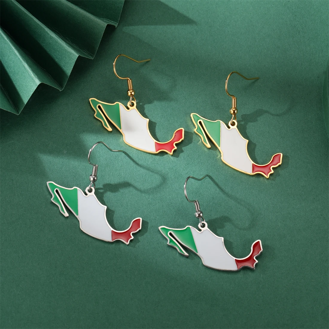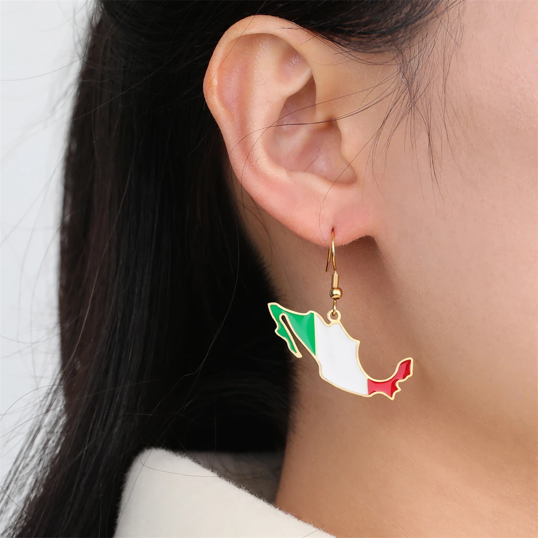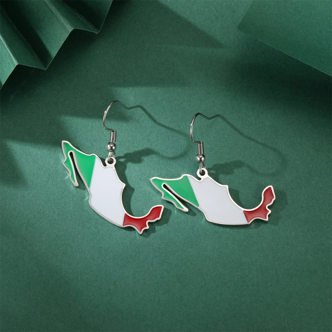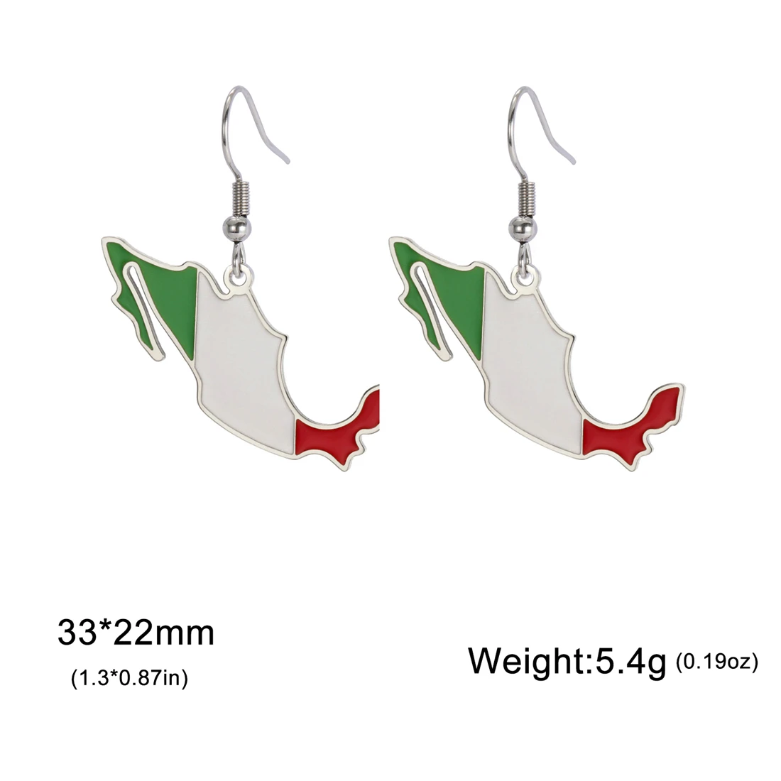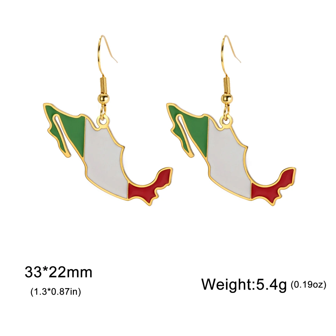 Step into a world of cultural elegance with this pair of Mexico Map Earrings, crafted from durable stainless steel. Featuring a sleek design, each earring showcases the iconic outline of Mexico, filled with vibrant enamel in the shades of green, white, and red, evoking the Mexican flag. The minimalist yet bold style is complemented by a delicate gold-tone outline and dangling design, creating a sophisticated silhouette. Measure approximately 33mm by 22mm, perfect for adding a touch of ethnic inspiration to any outfit. Their resistance to rust, corrosion, fading, and hypoallergenic properties ensure long-lasting wear. These earrings are ideal for any occasion, whether casual or formal, making them a versatile accessory that blends tradition with modern fashion effortlessly.