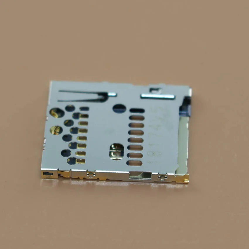 Experience seamless memory expansion with this high-quality micro SD card socket designed specifically for your Nokia Lumia 820. Crafted from durable silver-toned metal, this component features a sleek, industrial aesthetic with a compact rectangular shape. Its surface boasts a finely machined finish, punctuated by precision perforations and slots that ensure reliable insertion and secure holding of Micro SD cards. The small gold contact points provide excellent electrical connectivity, while the black plastic latch allows easy locking and removal of the memory card. Detailed notches and cut-outs facilitate perfect placement within your device. This socket enhances your phone’s storage capacity, ensuring a durable, high-precision connection that blends form with functionality.