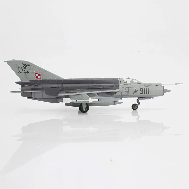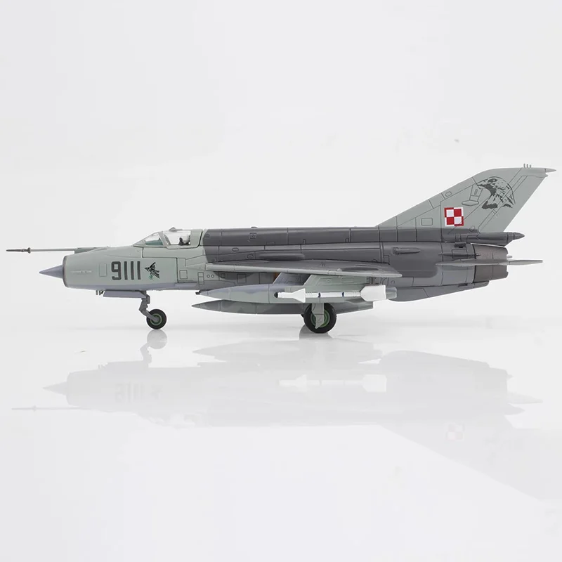 Experience the sleek power of this meticulously crafted MIG-21MF fighter aircraft model, designed in a realistic 1/72 scale. Made from high-quality alloy, it features a stunning metallic sheen that perfectly mimics the real aircraft's surface. Its aerodynamic design includes sharp angles and a pointed nose, finished in various shades of grey with a darker nose cone for contrast. The finely painted panel lines and surface details highlight its authenticity, while the clear canopy reveals intricately detailed cockpit instruments and an ejection seat. The vertical tail fin displays a bold red and white checkered Polish Air Force insignia, complemented by a small emblem on the tail tip. Its swept-back wings and tiny, shaped wheels give it a dynamic, realistic appearance perfect for display and admiration.