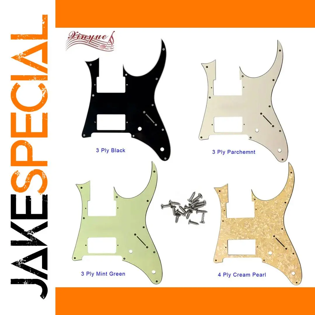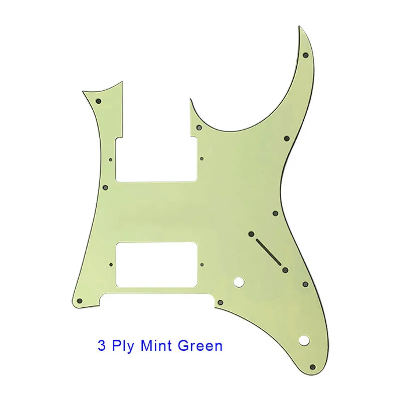 Experience transforming your guitar’s appearance with this stunning selection of pickguards designed specifically for the MIJ Ibanez RG350EXZ model. Crafted from high-quality composite materials, these pickguards feature a durable construction that provides excellent scratch resistance, protecting your instrument while enhancing its aesthetic appeal. Whether you prefer a sleek matte black, classic parchment, vibrant mint green, or luxurious cream pearl finish, this collection allows you to customize your guitar to match your style. Each pickguard includes a real aluminum foil shield to effectively reduce noise interference, providing a cleaner sound. With 10 mounting screws included, installation is straightforward, making it easy to upgrade your instrument’s look and functionality effortlessly.