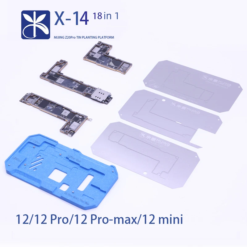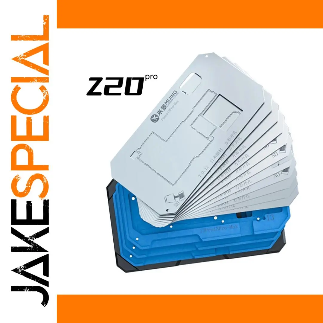 Step into professional phone repair with this exquisite MiJing 18-in-1 BGA reballing stencil. Crafted from a sleek, metallic material, it showcases a polished, thin surface with intricate etched outlines of internal components like chips, pads, and connectors. Designed for precise, double-sided use, it supports a wide range of iPhone models including X, XS, XS Max, 11, 11 Pro, 11 Pro Max, 12, 12 Pro, 12 Pro Max, 12 Mini, 13, 13 Pro, 13 Pro Max, 13 Mini, and the 14 series (14, 14 Plus, 14 Pro, 14 Pro Max). The edges are cleanly cut, with functional small holes and tabs for alignment. Encased in a sturdy black case with blue separators, it embodies professionalism, durability, and meticulous craftsmanship. Visualize yourself performing flawless reballing with this essential tool from MiJing, elevating the quality of your repairs.