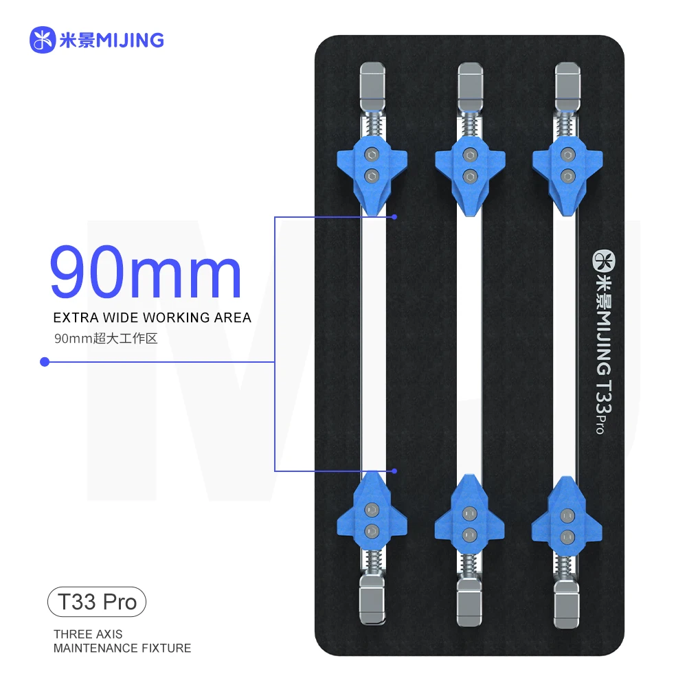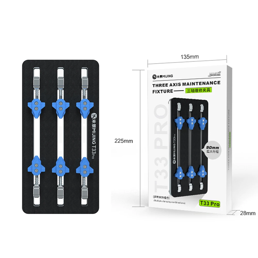 Experience professional-grade precision with this this Mijing T33 Pro multi-function three-axis repair fixture, specially designed for mobile phone and computer motherboard PCB IC repair. With an impressive 90mm wide working area, it provides ample space for handling various motherboard sizes, ensuring stability and accuracy during delicate repairs. Its sleek black design accentuates its modern industrial appeal, while the vibrant blue clamps add a touch of color, making the workspace visually organized and professional. The fixture's symmetrical buckle design allows it to securely hold even complex or odd-shaped motherboards, reducing slippage or damage. Crafted with durability and ease of use in mind, this tool becomes an essential part of any repair setup, elevating the quality and efficiency of your work.