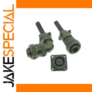 This MIL-C 5015 circular connector set includes robust plug and socket types, featuring models such as MS3102A, MS3106A, and MS3108A, with configurations like 14S-7, 14S-9, 14-7P, and 14-9P. Designed to military standard specifications, these connectors are rated for 220V and showcase an industrial, tactical aesthetic with an army green or olive drab finish. The cylindrical bodies have textured, ribbed grips, and the front features gold-plated contact pins arranged in a triangular pattern for reliable electrical connection. Recessed interiors and mounting flanges with three holes emphasize durability, making these connectors ideal for demanding military or industrial applications.