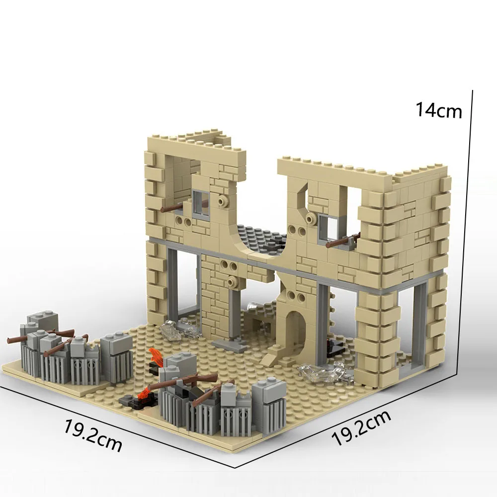 Transform your collection with this intricately designed military conflict scene architectural building blocks kit. Perfect for enthusiasts who crave authentic detail, this set allows you to recreate a war-torn building with weathered textures, damage effects, and military accessories. The realistic gray and beige color palette mimics concrete and brick surfaces, adding authenticity. The damaged structure, featuring missing sections and a prominent hole, brings a dramatic storytelling element to your display. The rooftop turret with black and orange accents enhances the military ambiance, while transparent window panes with crossbars add realism. Surrounding terrain includes beige interlocking tiles, scattered rocks, and leafless brown trees, completing a compelling battlefield scene. This model effortlessly combines craftsmanship and imagination, fitting beautifully as a home ornament or display piece.