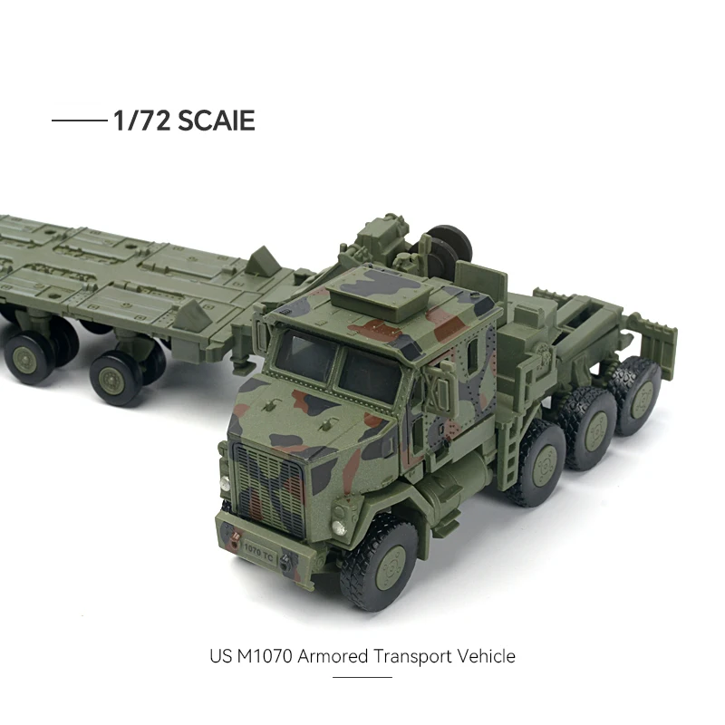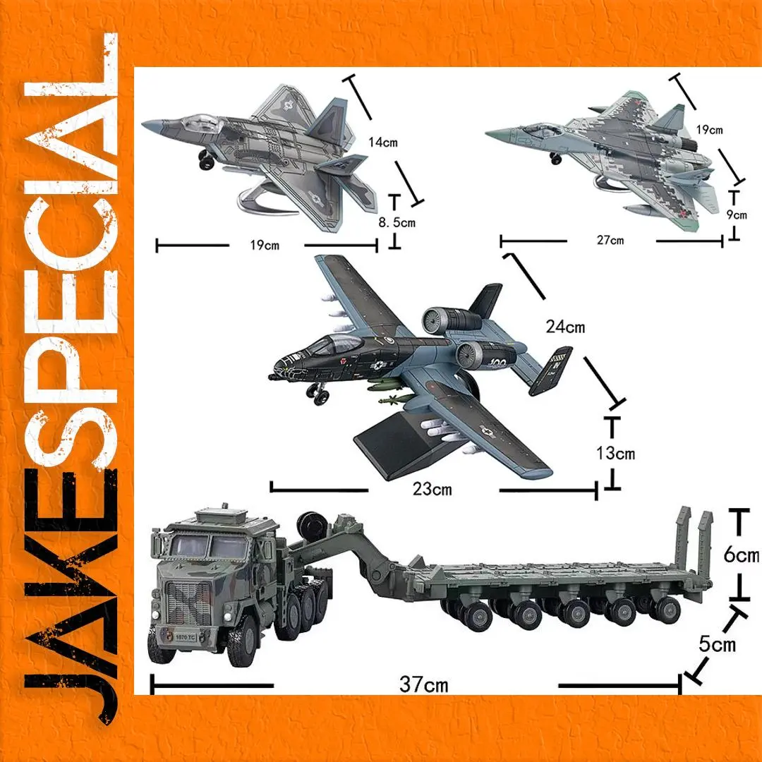 - Dimensions: A-10 at 24cm x 13cm; M1A2 tank at 37cm x 6cm; AH-64 at 27cm x 9cm; M1070 at 5cm high.