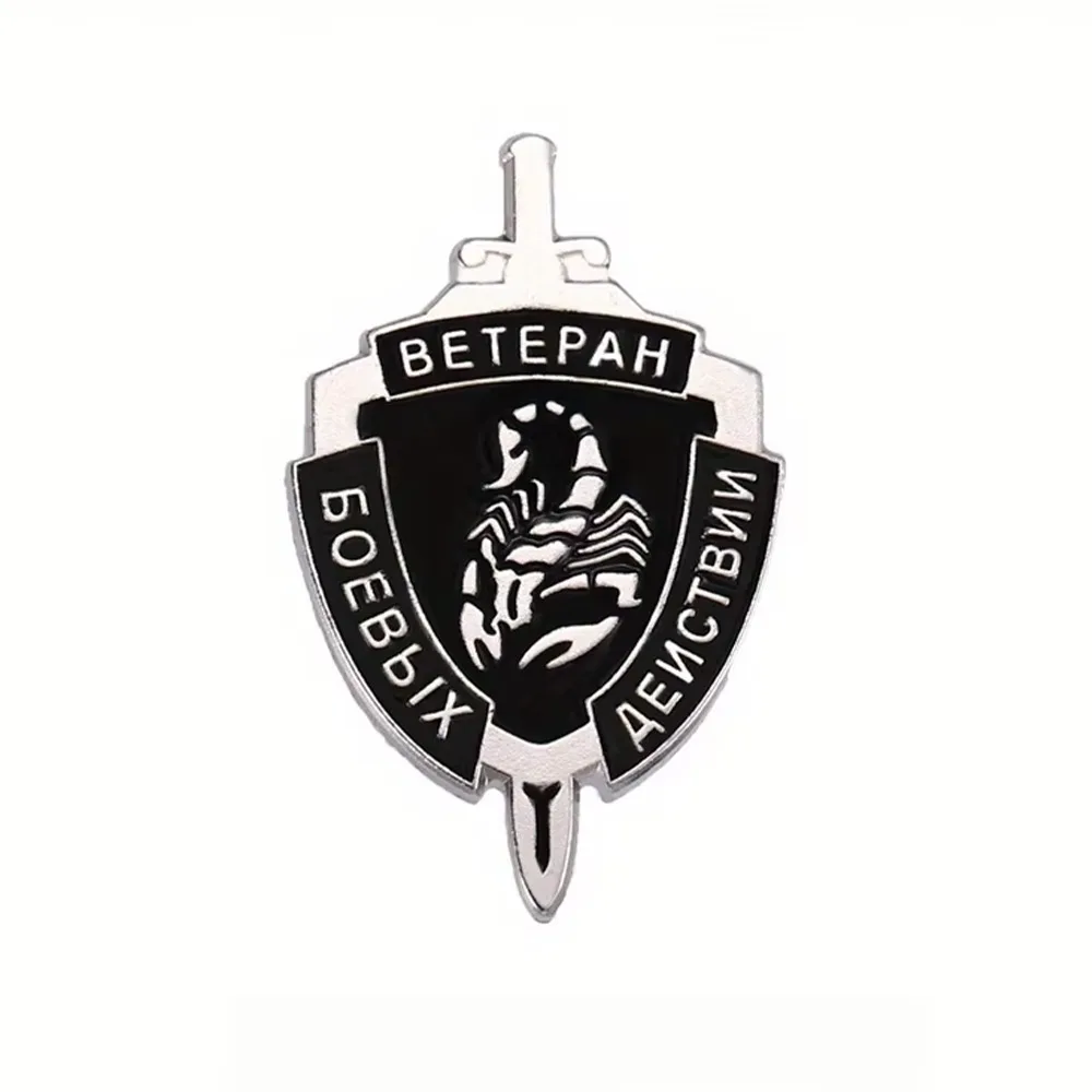 This striking military brooch is crafted from durable alloy and features a bold black and silver color scheme. Measuring 3cm in height and 1.8cm in width, it is lightweight at only 4g, making it perfect for attaching to clothing or bags. The shield-shaped design prominently showcases a detailed black and white scorpion emblem, flanked by two stylish Cyrillic banners reading “ВЕТЕРАН” and “БОЕВЫХ ДЕЙСТВИЙ.” The polished metal finish adds a shiny, reflective quality, making it a rugged yet stylish accessory suitable for outdoor events, parties, camping, or as a thoughtful gift.