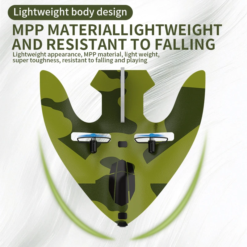 Immerse yourself in the thrill of flying with this striking military-style shark-themed RC drone. Its sleek, low-profile body, painted in a green camouflage pattern with darker green, tan, and black accents, creates a rugged yet playful look. The bold shark face graphic, complete with white teeth and a red tongue, adds an aggressive edge, perfect for outdoor adventures. Equipped with transparent blue propellers on black motors, curved supports and fin details enhance its realistic military aesthetic. Lightweight yet durable, made of flexible EPP foam, it offers excellent fall resistance. Whether you're a beginner or an experienced pilot, this drone’s impressive performance and striking appearance make flying exciting and memorable.