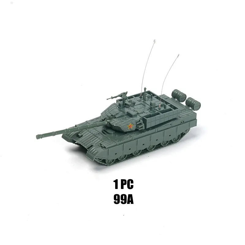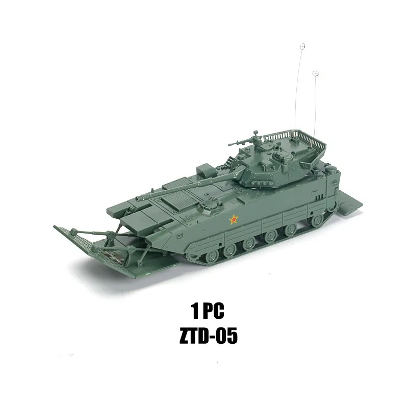 This detailed assembly model set features two military vehicles in 1:72 scale, each measuring approximately 18 cm in length. The ZTD-05 amphibious vehicle showcases a dark green hull with textured armor plating, sloped front design, and molded details such as hatches and panel lines, complete with a seated crew figure and weaponry. The ZTZ-99A main battle tank also measures 18 cm, highlighting a textured turret with angular surfaces, panel lines, vents, side skirts, and crew figures in gray uniforms. Crafted from 50 plastic pieces, this set is ideal for enthusiasts aged 12 and up, offering a realistic representation of rugged military machinery with highly detailed surface textures and functional design elements.