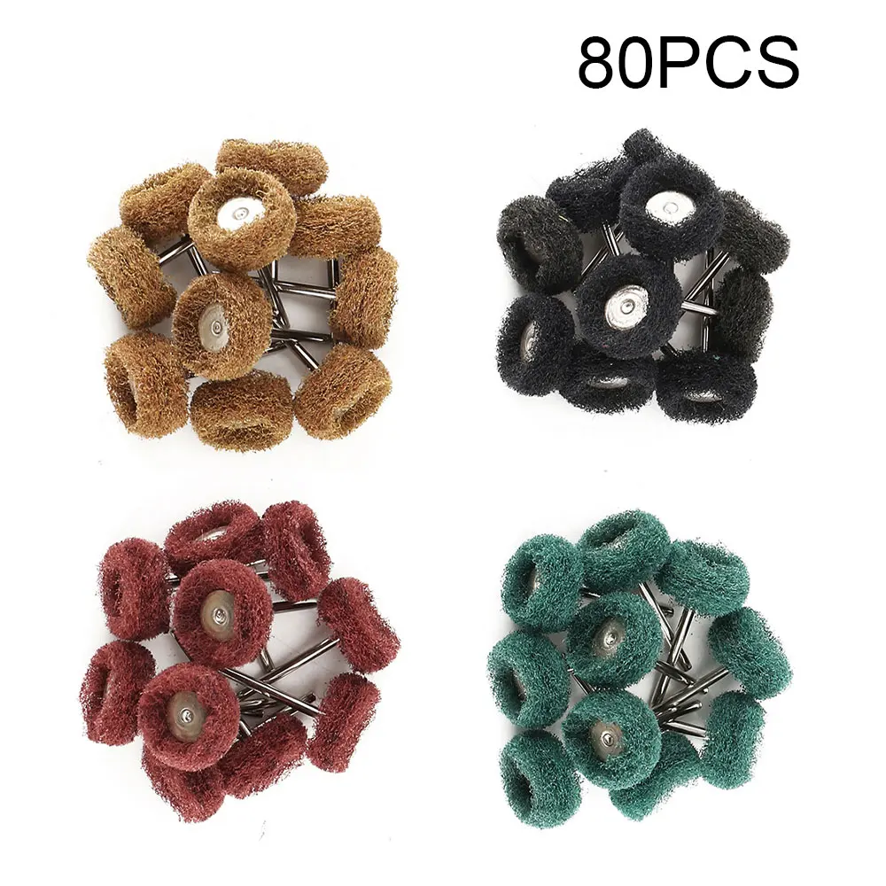Enhance your rotary tool projects with this set of 40 or 80 mini abrasive grinding wheels and nylon fiber polishing brushes, designed for durable performance across multiple materials. Each wheel features a 25mm diameter and 46mm length, with grit options including 120 (brown), 180 (green), 320 (red), and 400 (black), ideal for cleaning, rust removal, grinding, deburring, polishing, and slag stripping. Compatible with tools utilizing a 1/8-inch (3mm) shank, these versatile accessories are suitable for metal, glass, stone, ceramics, wood, jade, cast iron, and stainless steel, offering precision finishing for various DIY and professional applications.