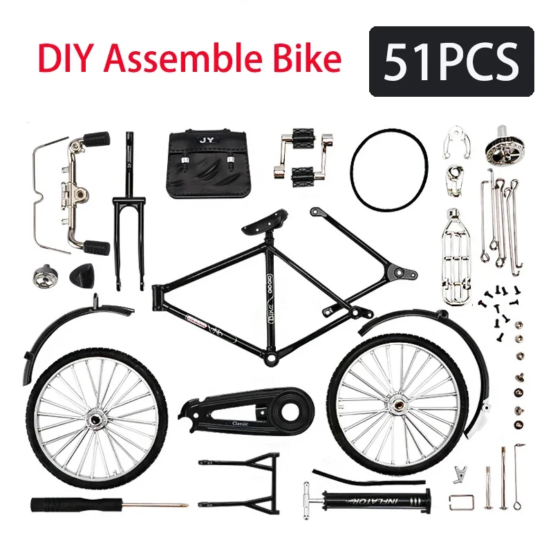 Discover this meticulously crafted 51-piece mini alloy bicycle model, measuring 22 cm in length, perfect for display and collection enthusiasts. Featuring a sleek black frame with a classic diamond shape, metal-spoked wheels with bold black tires, and additional components like a black fender, handlebar grips, and gear elements, this assembled sliding replica combines realistic detailing with modern minimalism. Made from durable plastic and non-electric, it’s designed for children aged 14 and above, making it an ideal collectible gift. CE certified and free from harmful chemicals, this model showcases exquisite craftsmanship, offering a unique way to appreciate miniature bicycle design and engineering.