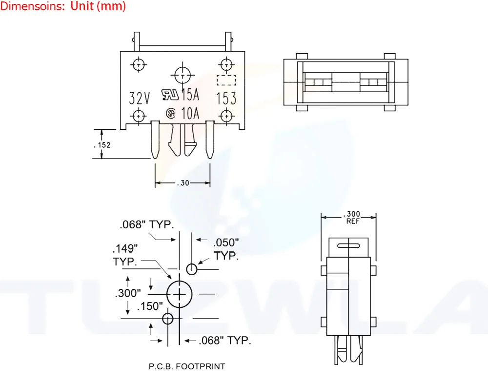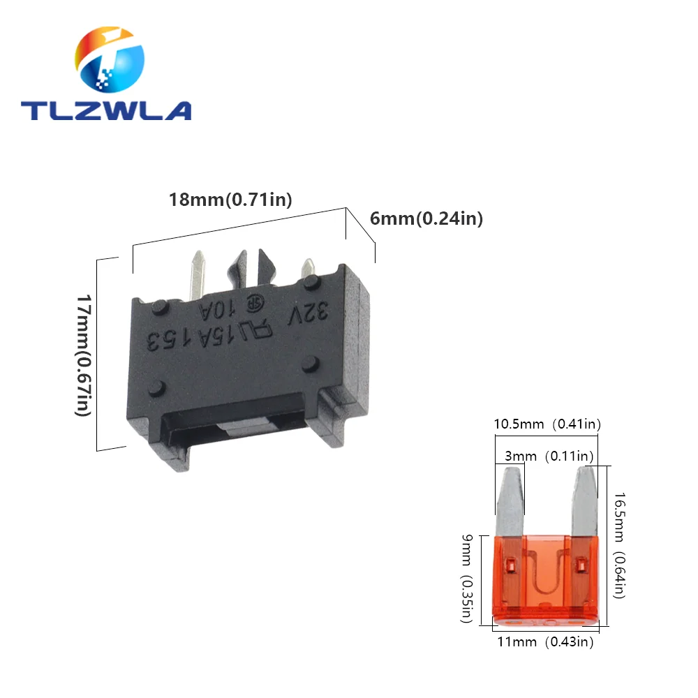 Experience a reliable connection for your automotive electronic projects with this set of five mini fuse holders, expertly designed for PCB mounting. Crafted from heat-resistant, durable thermoplastic, these fuse holders feature a sleek black matte finish complemented by vibrant, transparent blue covers that allow clear visibility into the fuse compartment. Each unit is equipped with a locking anchor and standoffs, ensuring a secure mechanical bond and accommodating circuit board washing. The shiny copper alloy clips with tin plating improve corrosion resistance, providing longevity and performance under automotive conditions. Compatible with 32V MINI blade fuses rated up to 20A, these fuse holders support a range of fuse ratings from 1A to 40A, making them versatile for various vehicle systems, sensors, and entertainment setups.
