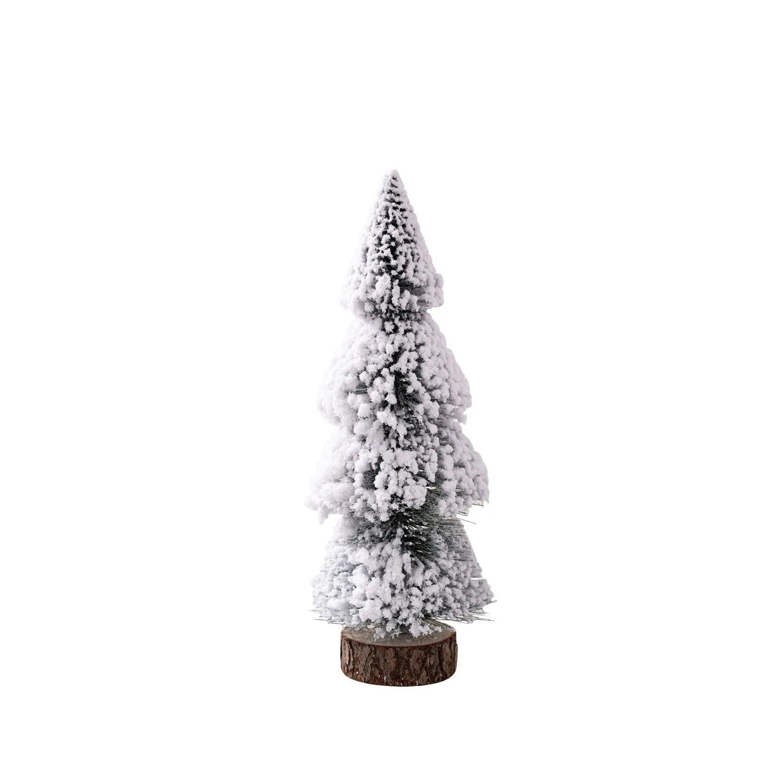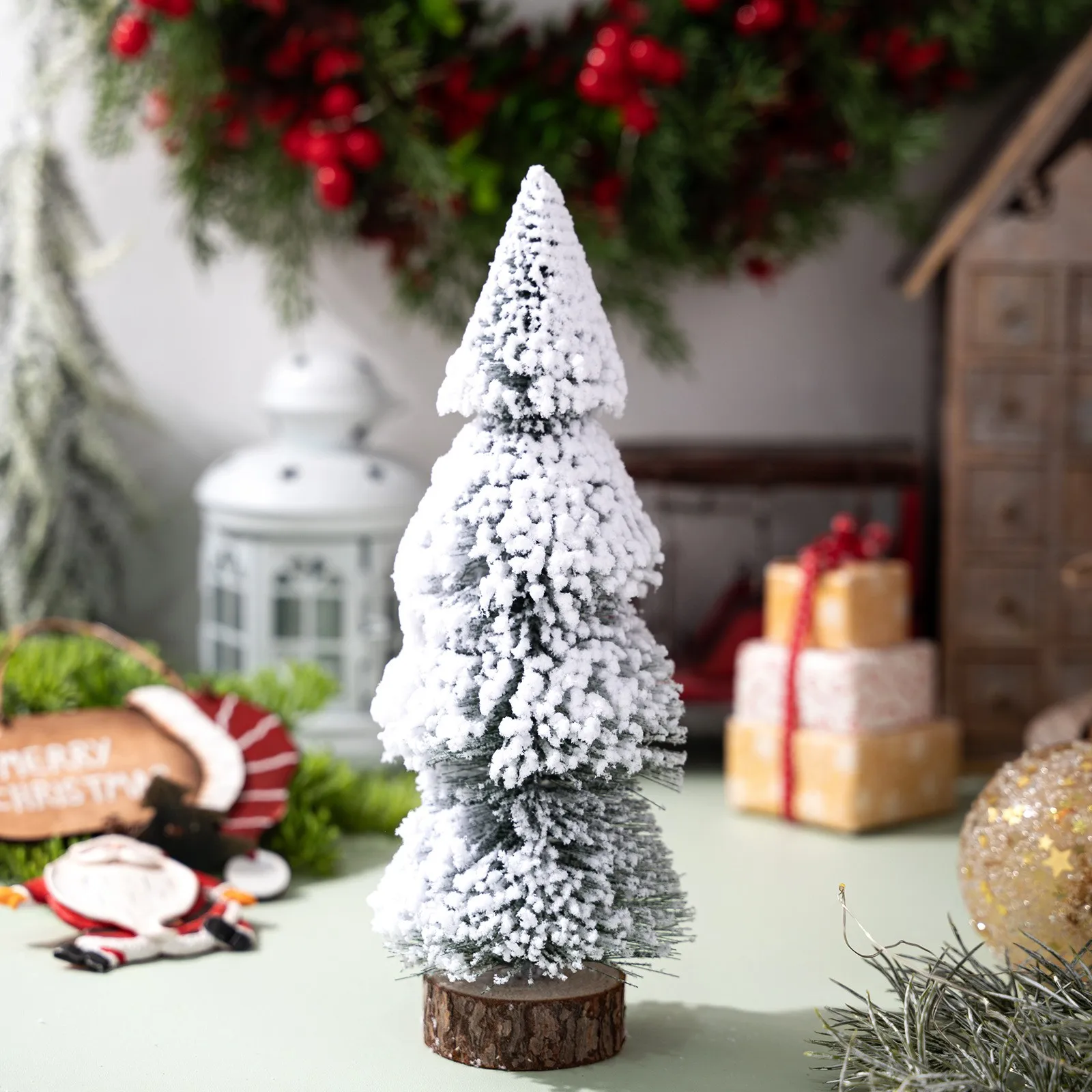 Imagine adding a cozy winter touch to your home or workplace with this charming set of four mini Christmas trees. Each tree is exquisitely crafted from plastic, wood, and flocking material, mimicking the appearance of snow-covered pine trees. Their detailed, layered branches and realistic snow finish bring a winter wonderland feel right to your fingertips. The trees vary in size, creating a visually appealing layered display on any surface. Mounted on stable round bases, they are perfect for decorating desktops, windowsills, mini gardens, or enhancing your holiday displays. Their versatile size and elegant design make them a timeless addition to your seasonal décor, lifting the spirit of any setting with warm, festive charm.