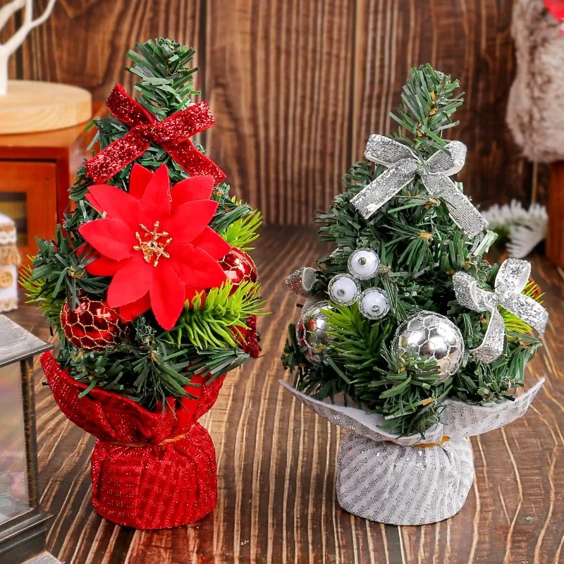 Imagine adding a touch of holiday magic to your space with this charming 20cm mini Christmas tree. Crafted from high-quality PVC and cloth, it features dense, realistic pine foliage in vibrant green, beautifully decorated in three elegant colors—gold, red, and silver. The gold version boasts shimmering spherical ornaments and a glittery bow, perfect for sophisticated holiday decor. The red tree is topped with a bright poinsettia flower, complemented by a red patterned cloth base, creating a warm festive vibe. The silver variant showcases reflective ornaments and a glittery bow, ideal for a classy, wintery touch. Its compact size makes it perfect for desks, tables, or small spaces, instantly transforming your environment into a cheerful holiday setting or a thoughtful gift option. Bring festive joy to your home effortlessly with this versatile miniature tree.