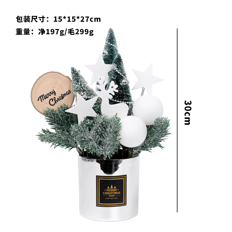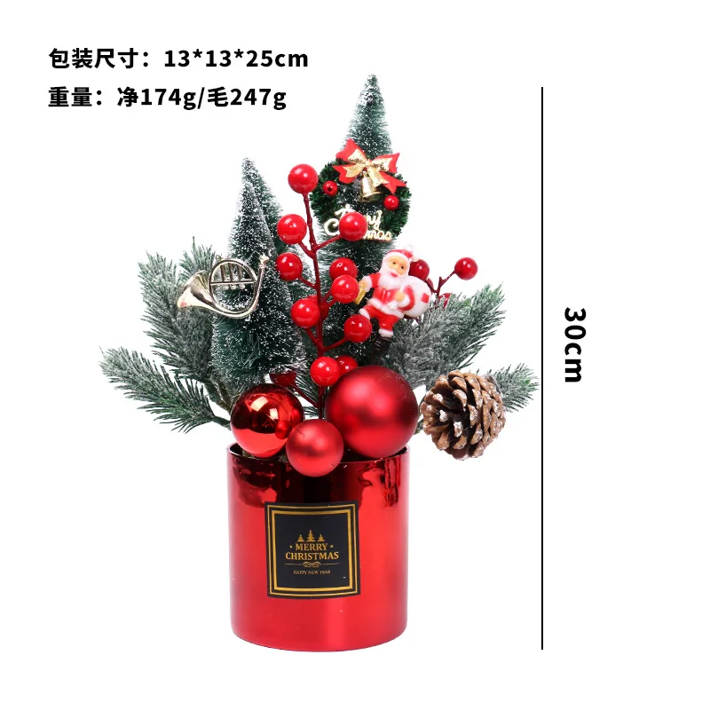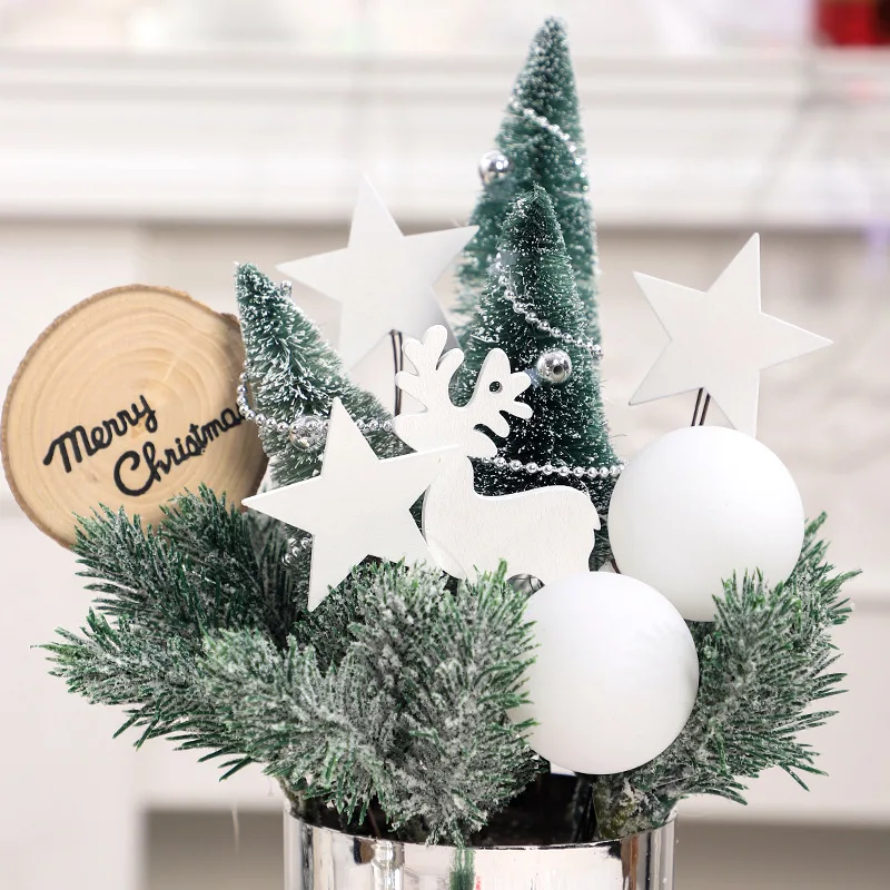 Imagine adding a touch of holiday cheer to your home or workspace with this beautifully crafted mini Christmas tree. Designed for desktop decoration, it creates an inviting and cozy atmosphere during the festive season. Available in two elegant styles—Style A with vibrant, traditional colors, and Style B with a sleek, modern look—you can choose the one that best matches your holiday decor. The arrangement features snow-flocked artificial pine branches, complemented by festive ornaments like shiny red balls, white star-shaped decorations, and miniature pine trees. Whether used as a centerpiece or a gift, this mini tree brings warmth, joy, and a cheerful spirit that enhances any space during Christmas and New Year celebrations.