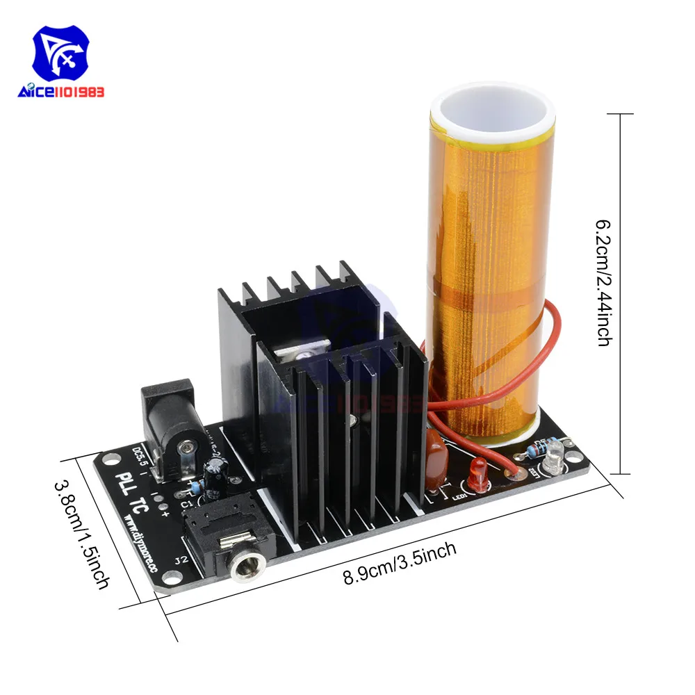 Experience a futuristic audio enhancement with this mini coil plasma speaker module. Its sleek, industrial design features a matte black circuit board highlighted by a vibrant orange cylindrical coil, creating a striking visual contrast. Adjacent to the coil, a black finned heatsink adds a rugged, technical appeal while ensuring efficient cooling. The compact size of 38x79mm makes it ideal for various DIY audio projects, offering 15W of power and high-frequency response for rich stereo sound. The module’s modern appearance, combined with exposed high-voltage components, embodies cutting-edge technology. Whether you're integrating it into a custom sound system or experimenting with plasma arc effects, this module blends visual impact with excellent audio performance, making your projects come alive with style and function.