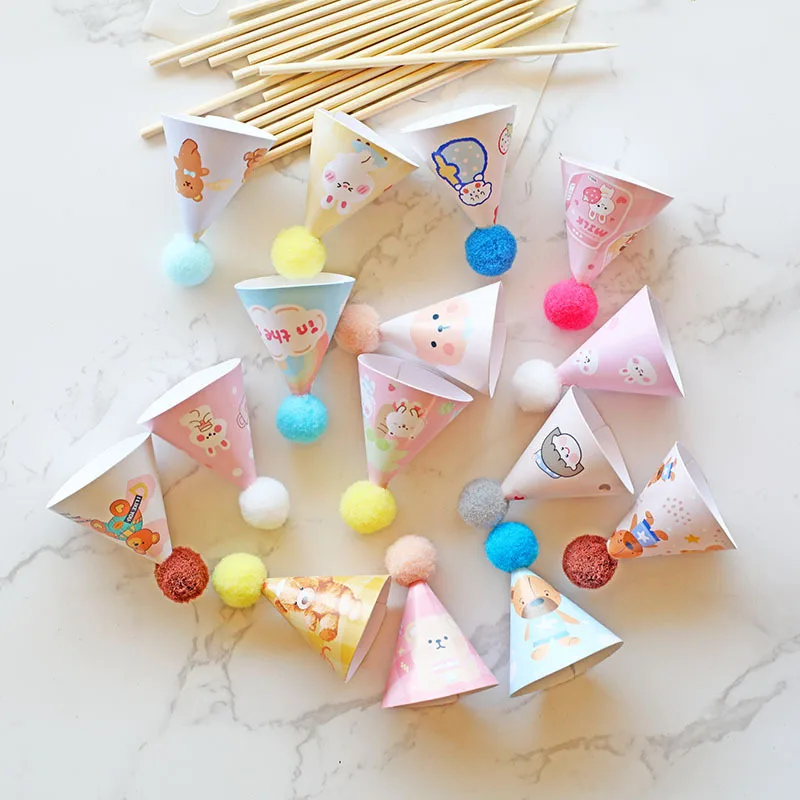 Imagine adding a burst of color and fun to your celebration with this set of 15 mini birthday hat cake toppers. Designed with playful cartoon animal prints and cheerful patterns, these toppers bring an instant joyful atmosphere to any event. Made from durable, printed cardboard, each approximately 4 centimeters tall, they require simple hand-assembly to achieve their cone shape and attach the fluffy pom-pom on top. Perfect for birthdays, weddings, holidays, or any festive occasion, they promise to turn your desserts into eye-catching centerpieces. Their bright colors and whimsical motifs make every cake memorable. You’ll love how easy it is to create a lively, colorful decoration that perfectly matches your celebration theme.
