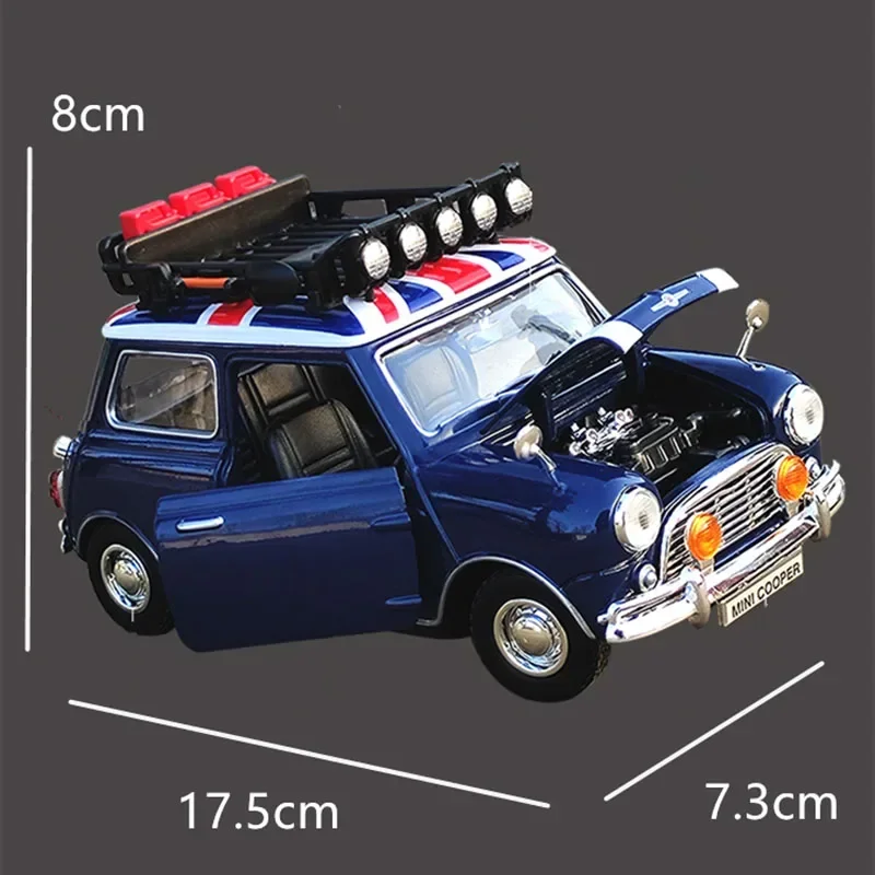 - Scaled at 1:18, measuring 17.5 cm long, 7.3 cm wide, and 8 cm high, accurately representing the vintage Mini Cooper's sleek, rounded design.