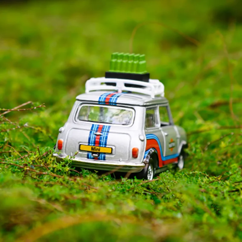 Experience the timeless charm of the Mini Cooper MK1 with this finely crafted diecast model, scaled at 1/50. Its sleek silver alloy body is complemented by bold racing stripes featuring a central blue line flanked by narrower red lines, embodying a sporty vintage aesthetic. The model showcases realistic details, including a detailed front grille with vertical bars, clear windows, side mirrors, and textured tires that mimic true rubber. Sporting a white roof rack holding a textured green luggage container, it adds a rugged, nostalgic charm perfect for static display or as a thoughtful gift. Bring a piece of classic automotive history into your collection, and imagine this beautiful model displayed on your shelf, appreciating the craftsmanship and style it exudes.