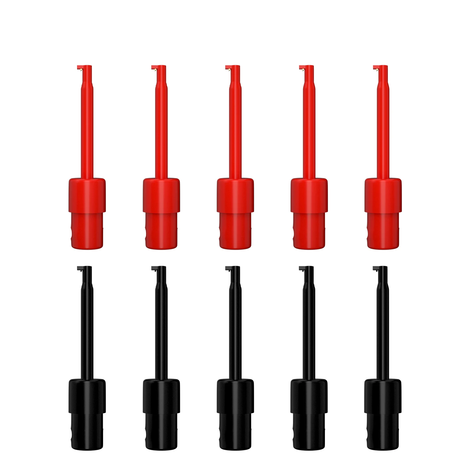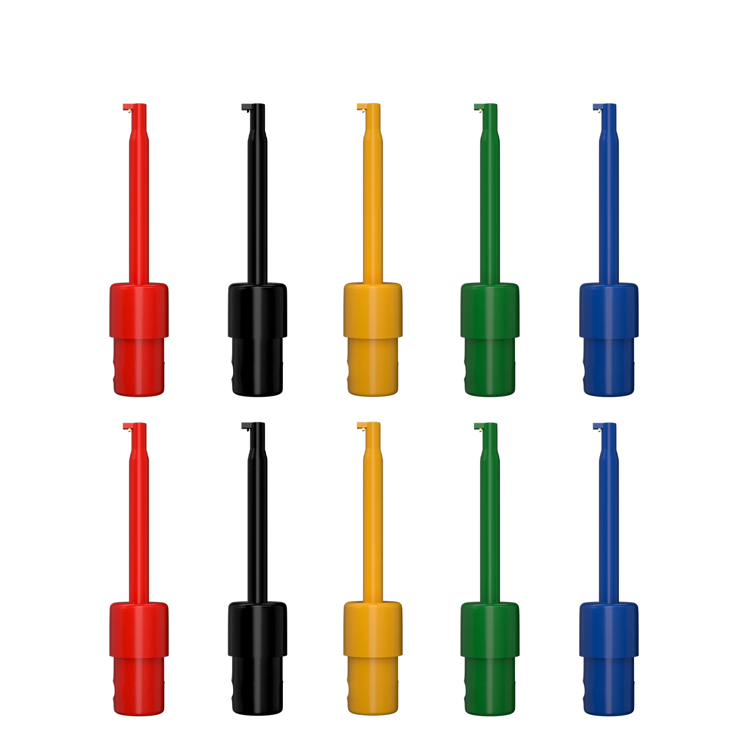 - Set of 10 mini copper test hooks with vibrant, solid-colored plastic covers for easy component identification during testing.