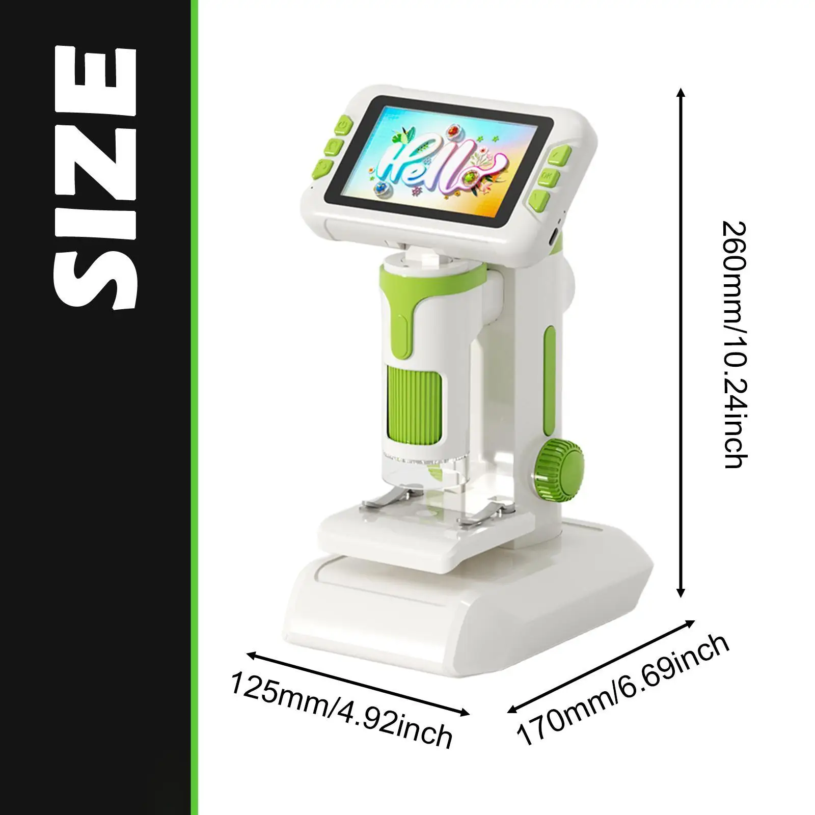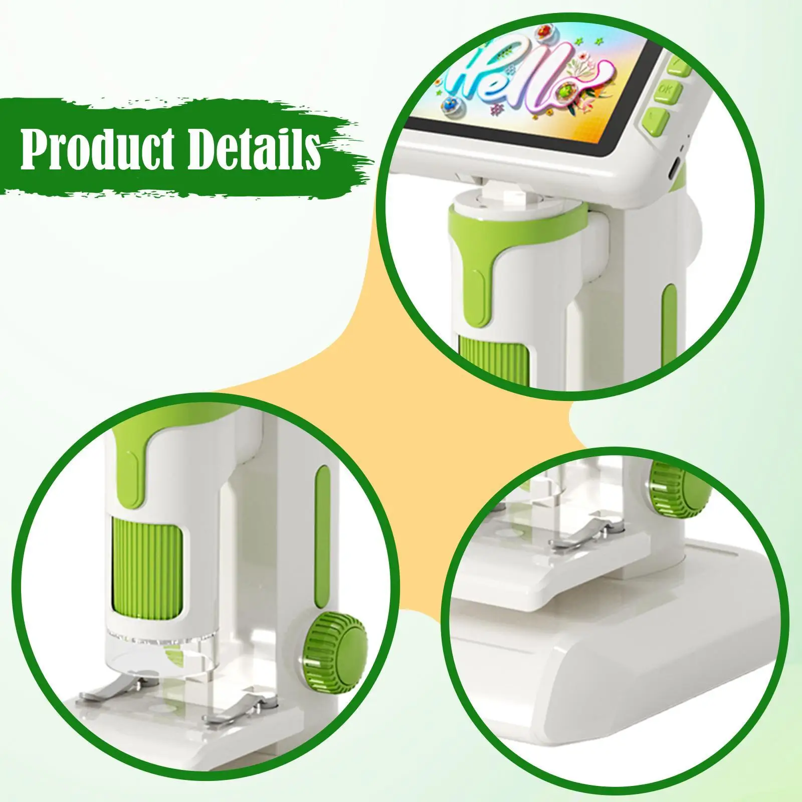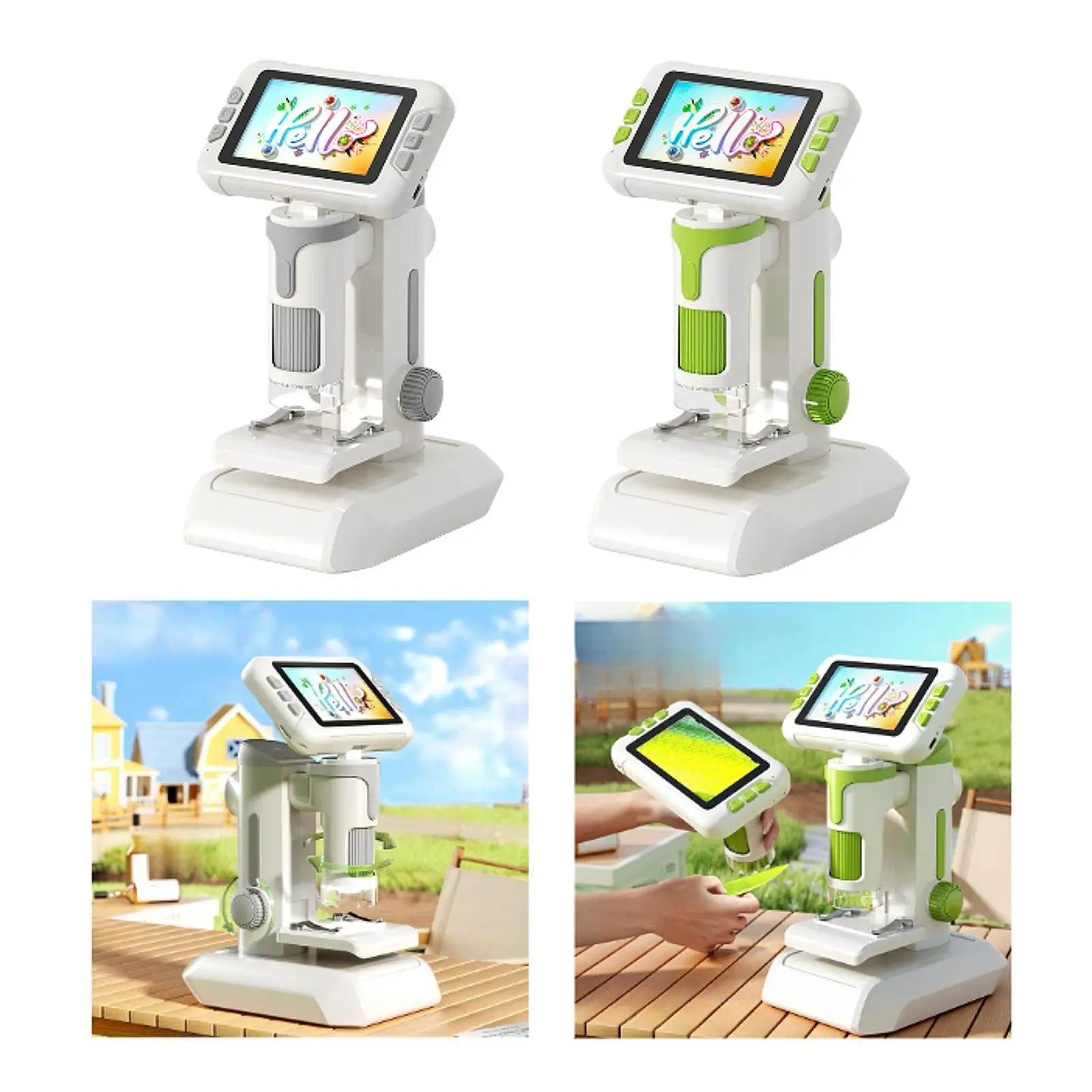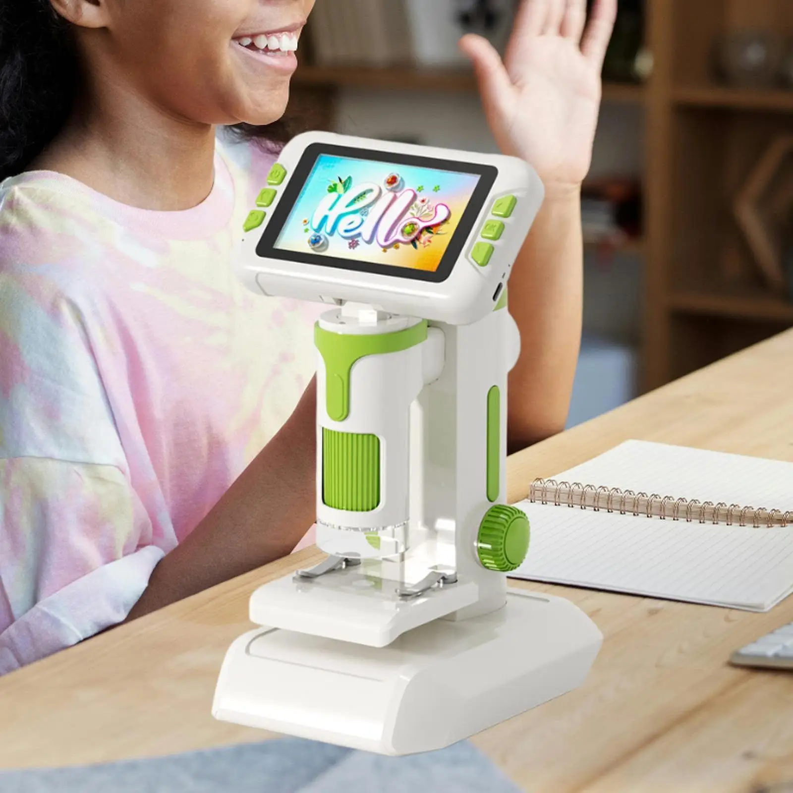 Enjoy exploring the tiny world with this colorful, vibrant children's digital microscope, designed to inspire curiosity and learning. Its compact, lightweight white body enhanced by lively green accents makes it appealing for young explorers. The rotatable 4-inch display allows flexible viewing angles from 0° to 90°, offering comfort during use. With adjustable focus from 100x to 1600x magnification, kids can capture detailed images and videos of insects, plants, and textures. The built-in LED light has three brightness levels, adapting to various environments. Its versatile detachable structure enables switching between handheld, stand, and portable modes for outdoor adventures or classroom activities. This modern design emphasizes safety with rounded edges and simple controls, making science exploration both fun and accessible. It’s an excellent educational tool that encourages creativity and observation skills in children aged 4-6.
