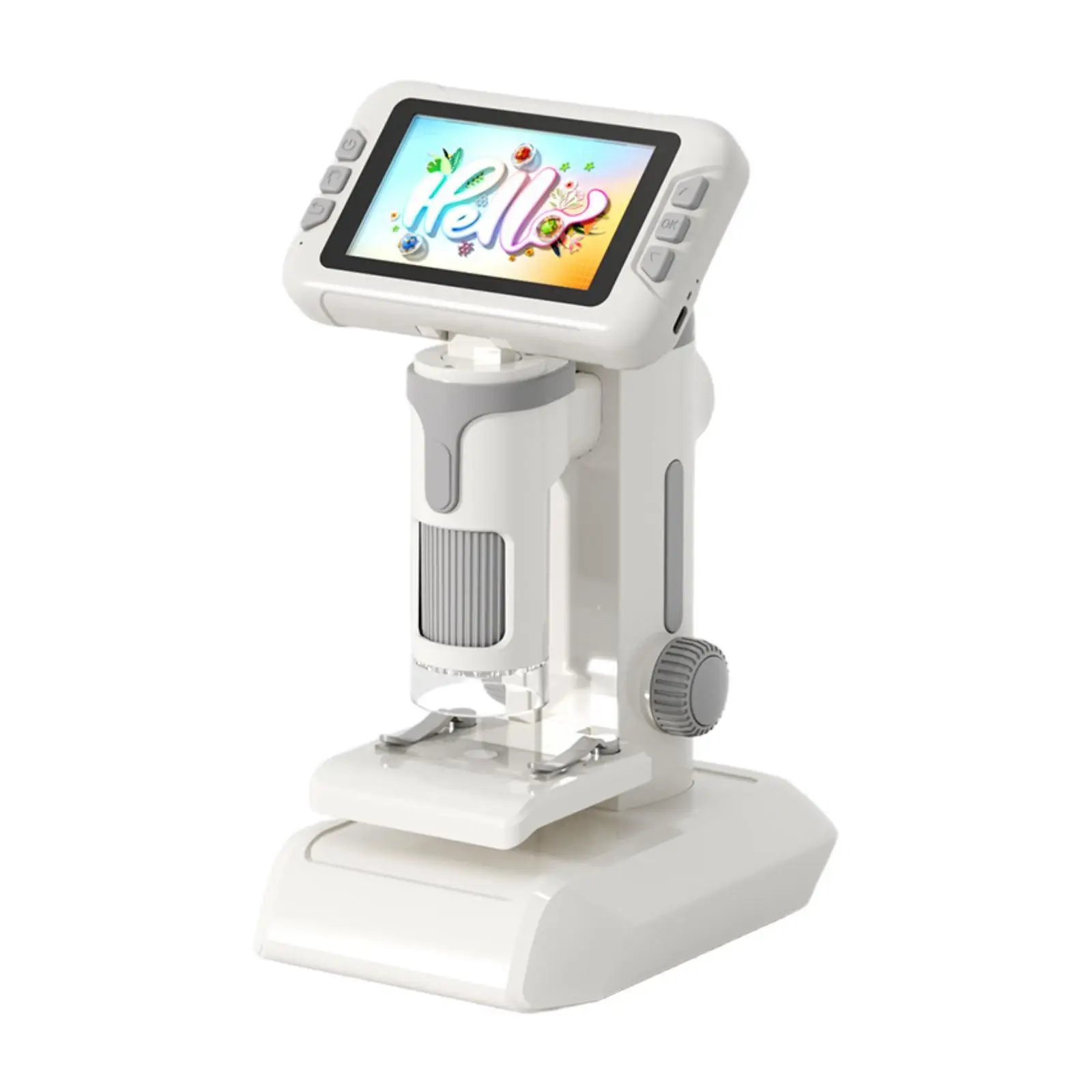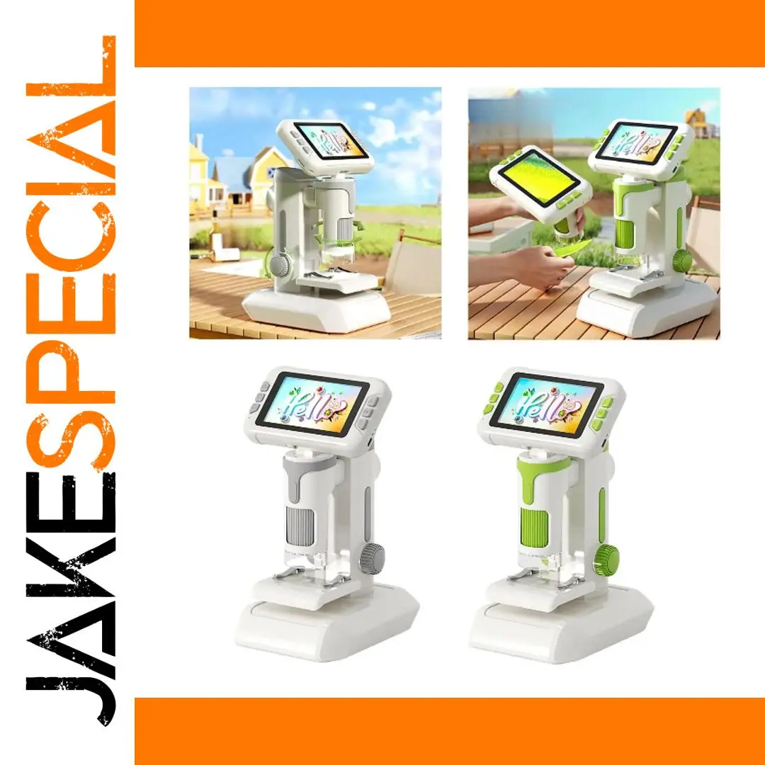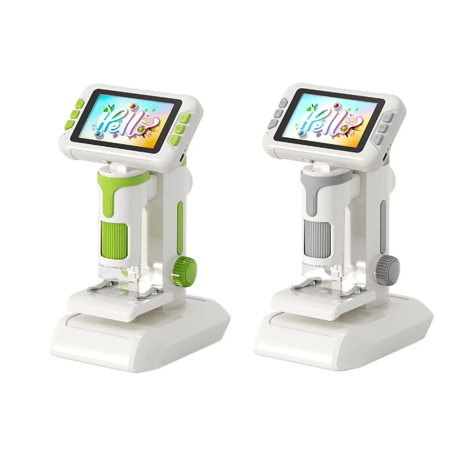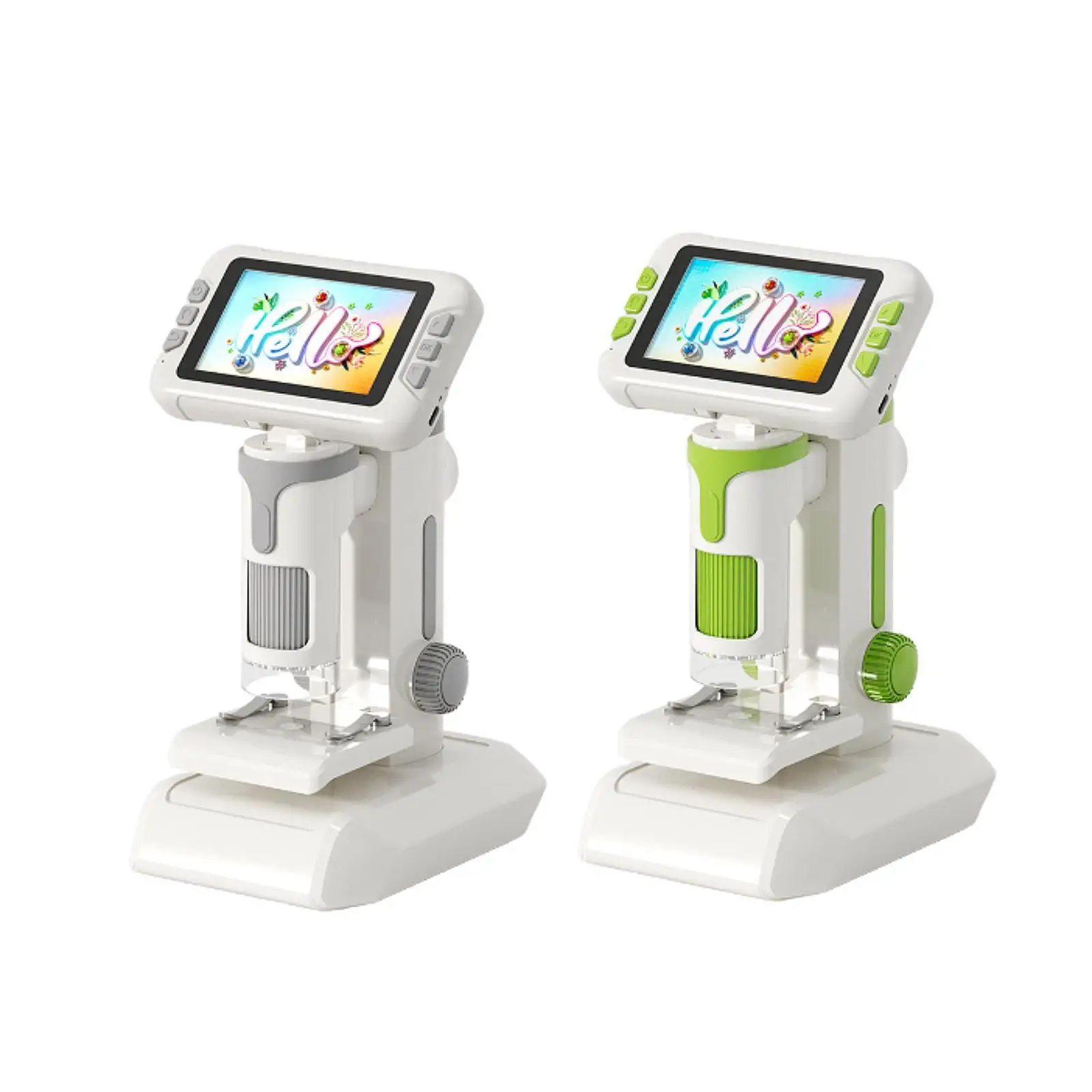 Enjoy exploring the tiny world with this colorful, vibrant children's digital microscope, designed to inspire curiosity and learning. Its compact, lightweight white body enhanced by lively green accents makes it appealing for young explorers. The rotatable 4-inch display allows flexible viewing angles from 0° to 90°, offering comfort during use. With adjustable focus from 100x to 1600x magnification, kids can capture detailed images and videos of insects, plants, and textures. The built-in LED light has three brightness levels, adapting to various environments. Its versatile detachable structure enables switching between handheld, stand, and portable modes for outdoor adventures or classroom activities. This modern design emphasizes safety with rounded edges and simple controls, making science exploration both fun and accessible. It’s an excellent educational tool that encourages creativity and observation skills in children aged 4-6.